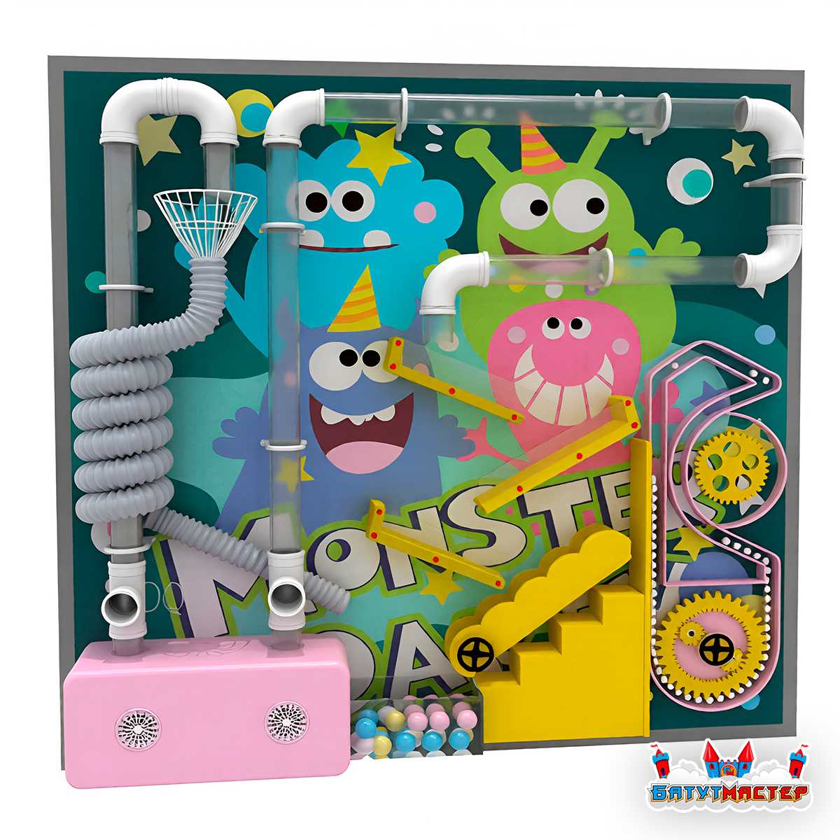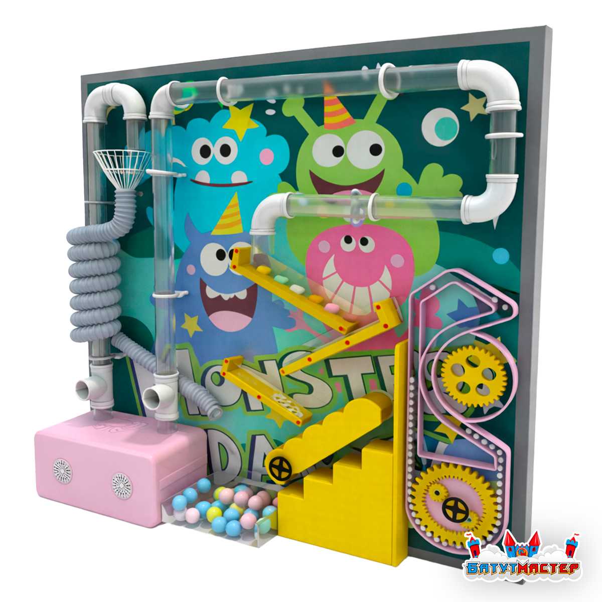 Интерактивная стена «Мир Монстриков» — это пневмолабиринт, который помогает превратить игровую комнату в яркое пространство эмоций, движения и настоящего детского интереса. Такой формат игрового оборудования отлично работает там, где важно не просто заполнить зону развлечений, а создать точку притяжения, к которой дети будут тянуться снова и снова. С первых минут внимание захватывает сама механика игры: легкие шарики движутся по прозрачным трубкам, меняют направление, поднимаются воздушным потоком и делают весь игровой процесс зрелищным, понятным и увлекательным.