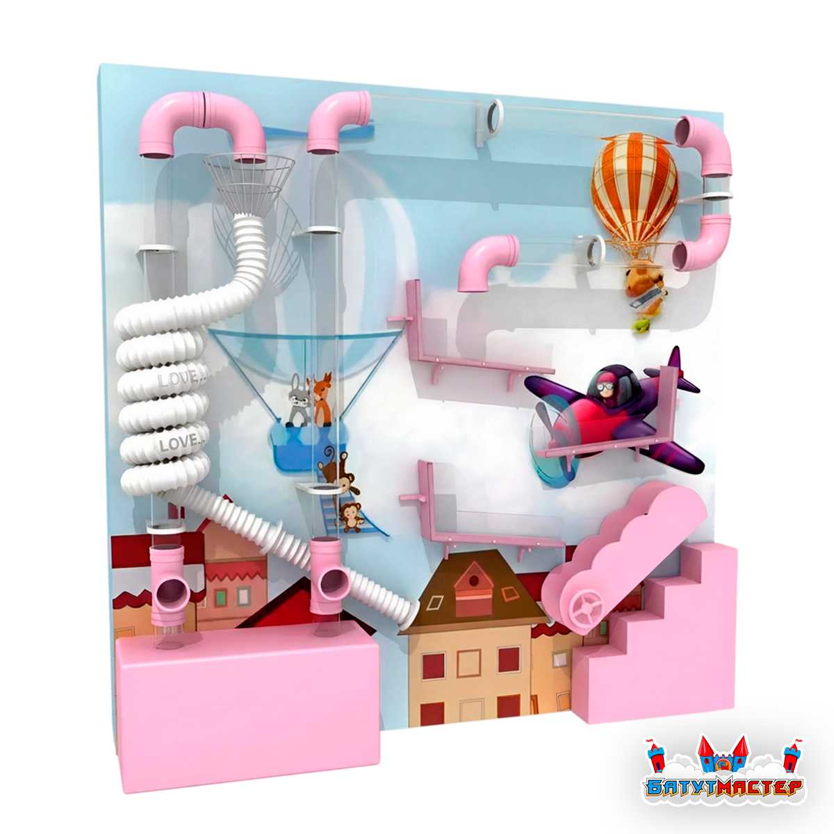 Основой пневмолабиринта является поток воздуха, который подхватывает лёгкие шарики и запускает их в движение по системе прозрачных труб.