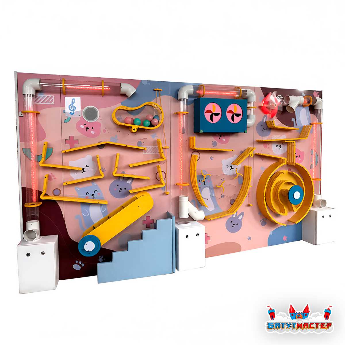 Представьте себе волшебную стену, внутри которой живёт собственная энергия — воздушные потоки, закручивающиеся спиралями, поднимающие и ускоряющие разноцветные шарики. Они словно маленькие путешественники, стремящиеся преодолеть лабиринт из прозрачных труб и ярких механизмов. Детям достаточно нажать кнопку или повернуть переключатель — и приключение оживает прямо на их глазах.