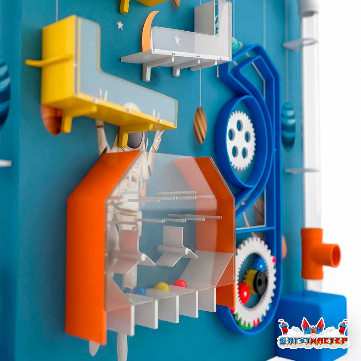 Представьте, что в центре вашей детской зоны открывается мини-космодром. Шарики становятся «ракетами», прозрачные трубы — тоннелями Вселенной, а каждое нажатие кнопки запускает новый полёт. Ребёнок делает маленькое движение — и яркий шарик взмывает вверх по прозрачному тоннелю, исчезает за поворотом и неожиданно вылетает в другом месте.