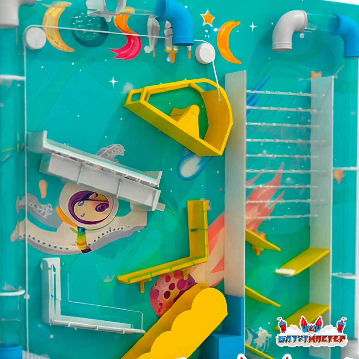 Представьте себе космический маршрут, где шарики превращаются в миниатюрные звездолёты, путешествующие по прозрачным туннелям под управлением детей. Воздушные потоки становятся «галактическим ветром», а яркие элементы стенда — интерактивными порталами, запускающими целую цепочку движений. Эта стена не просто развлекает — она погружает в мир фантазий и открытий.