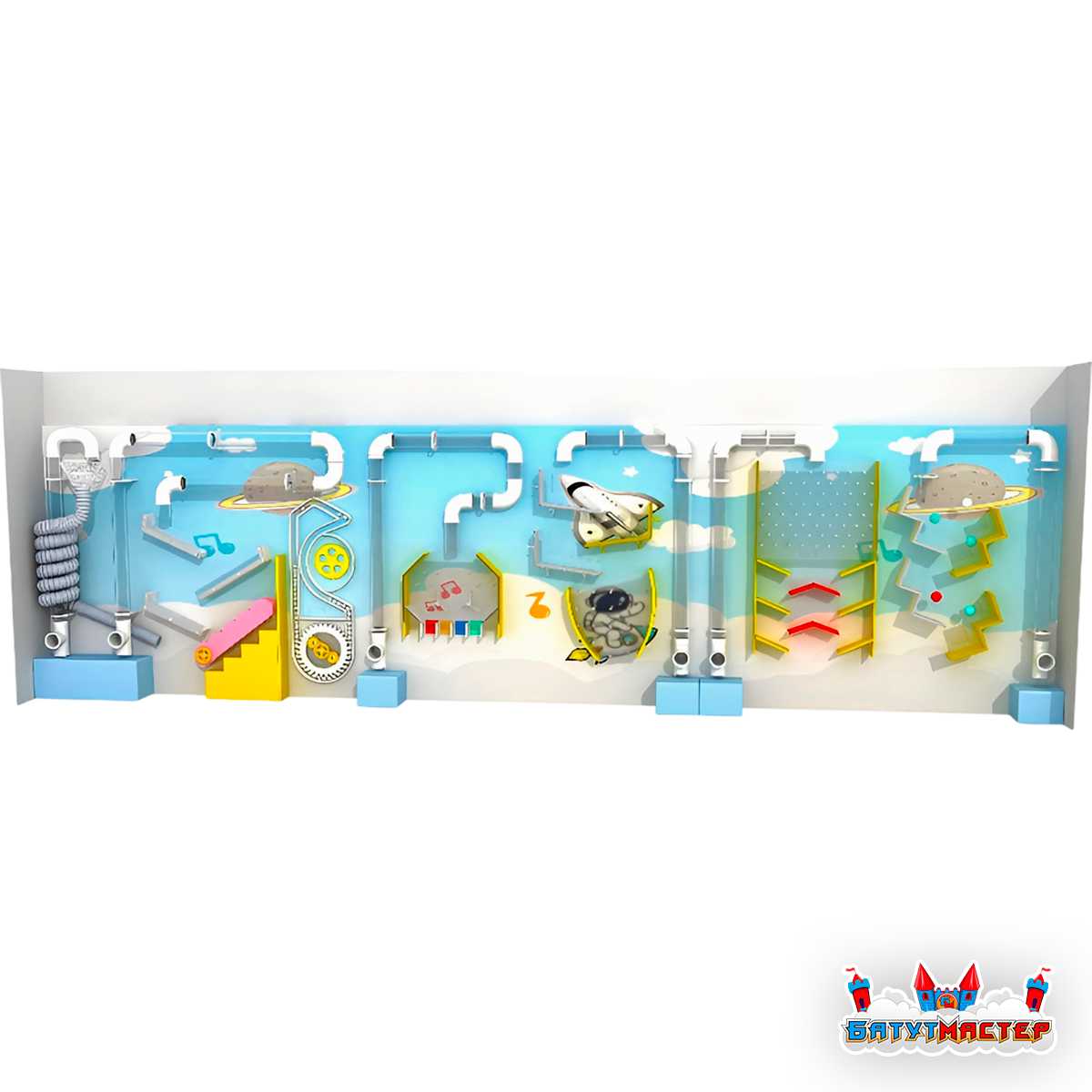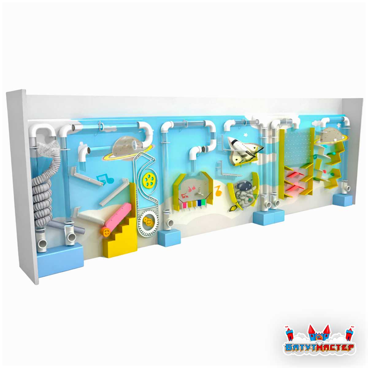 Интерактивная стена «Облачный космос» переносит детей в фантастический мир, где облака соседствуют с планетами, а движение воздушных потоков создаёт ощущение настоящей космической прогулки. Шарики словно становятся миниатюрными космонавтами, которые отправляются в полёт по прозрачным трубкам, взмывают вверх и снова возвращаются в стартовую точку, чтобы повторить новое приключение 🚀✨.Такое оформление вызывает чувство восторга, наполняет пространство атмосферой бесконечного неба и увлекает ребёнка в игру с первых секунд.