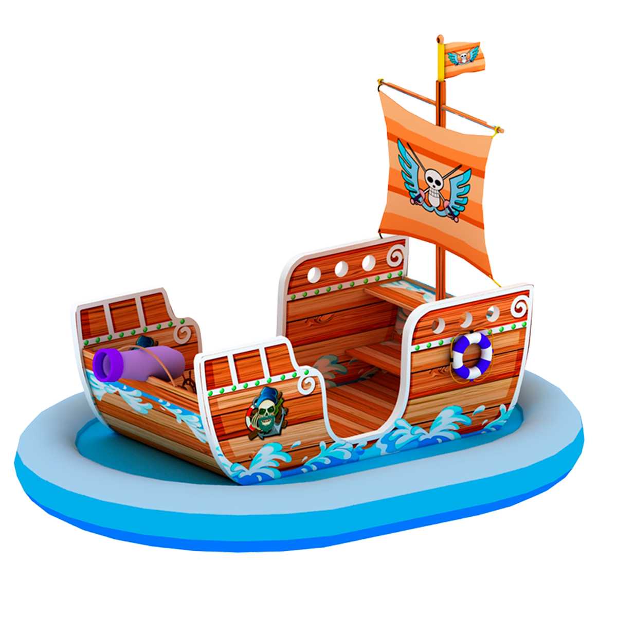 Качалка изготавливается в образе пиратского корабля с яркими декоративными элементами, аккуратными формами и дружелюбным оформлением. Она легко считывается ребёнком: