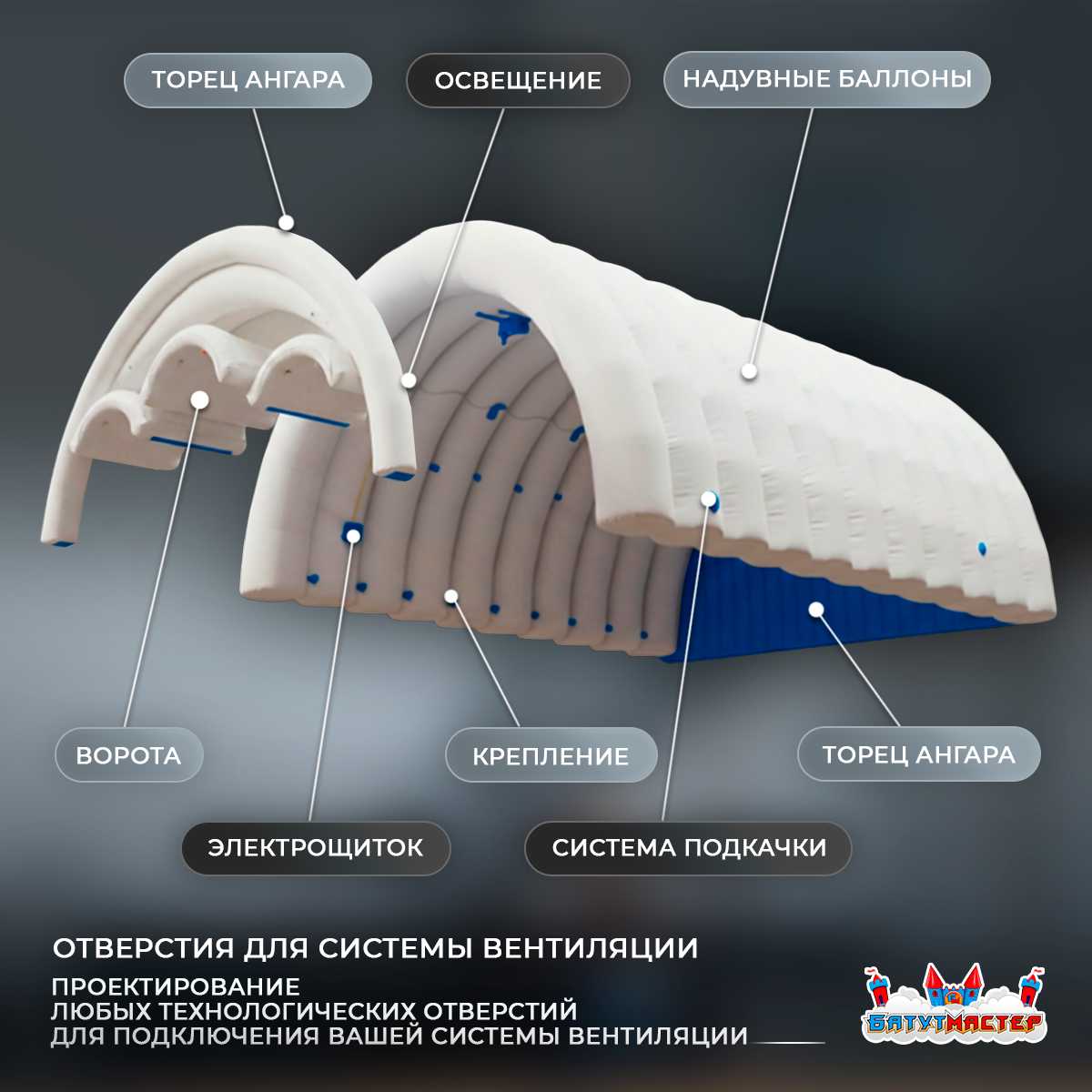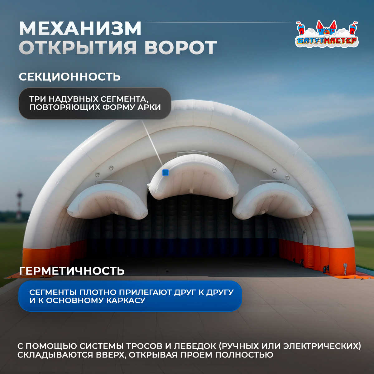 Основа ангара — система надувных баллонов, формирующих устойчивую арочную архитектуру.