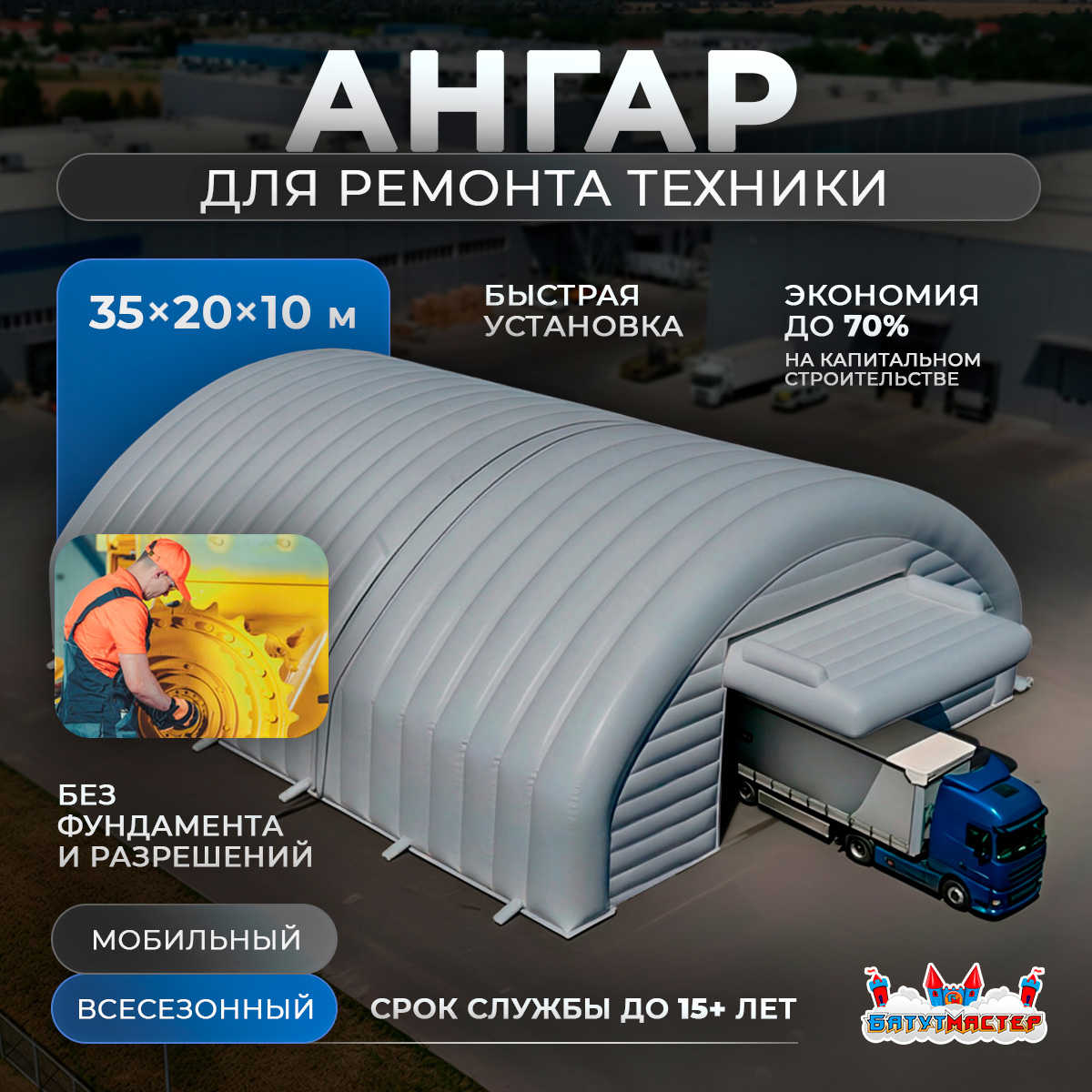 Мобильный ремонтный ангар «Штаб Ремонта» 35x20x10 позволяет создать полноценный сервисный центр прямо на месте работы техники. Надувные ангары из ПВХ быстро разворачиваются, защищают оборудование от погодных факторов и обеспечивают комфортные условия для специалистов.