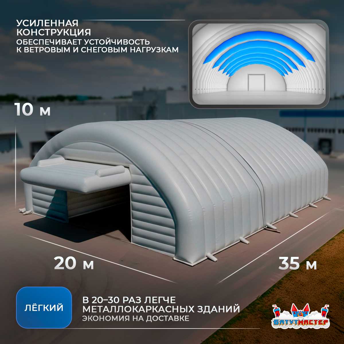 Ангар представляет собой пневмокаркасное сооружение, основанное на системе герметичных надувных баллонов, формирующих прочный арочный каркас.