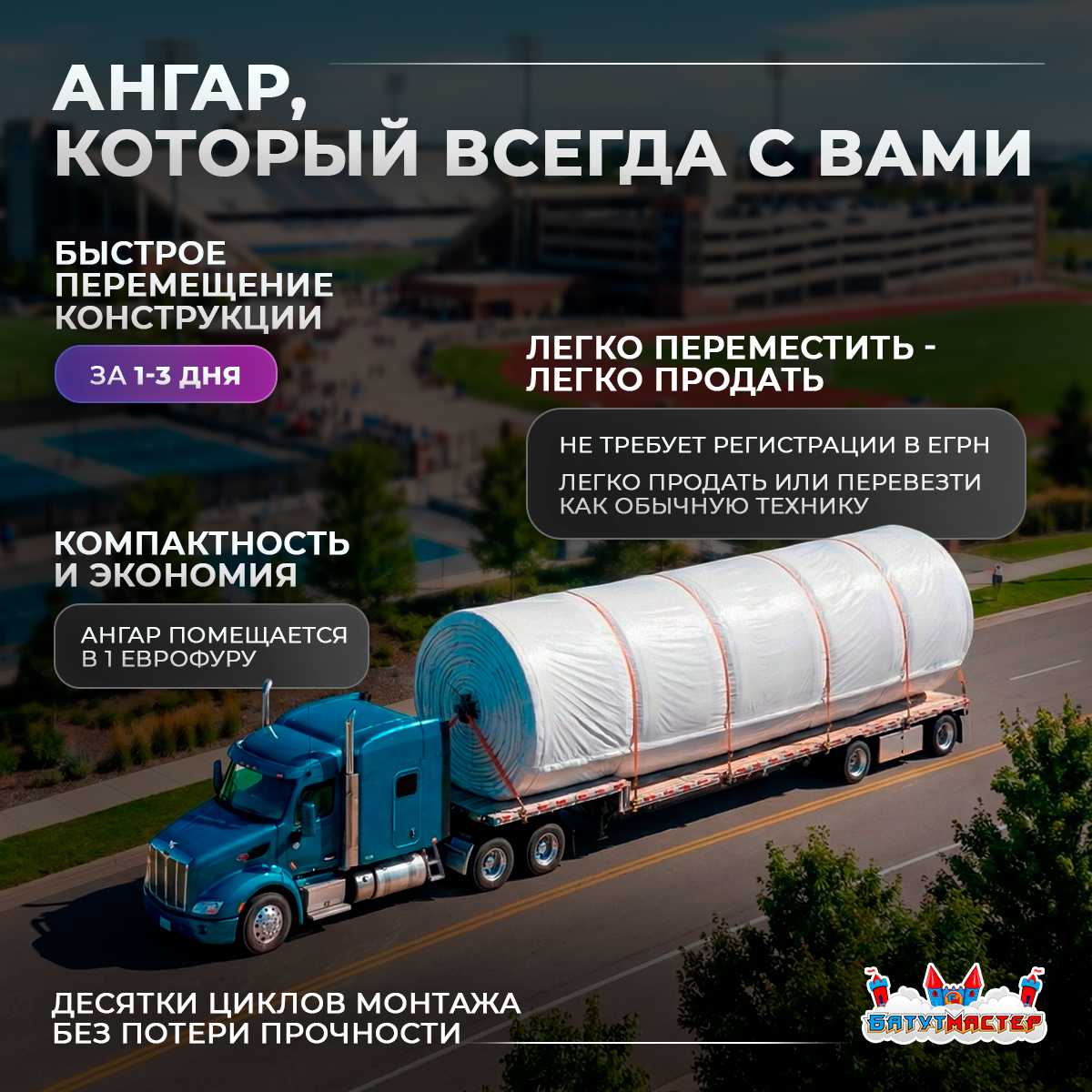 После демонтажа конструкция компактно упаковывается и перевозится обычным грузовым транспортом. Ангар можно переместить на новую площадку, использовать в другом городе или продать как оборудование.