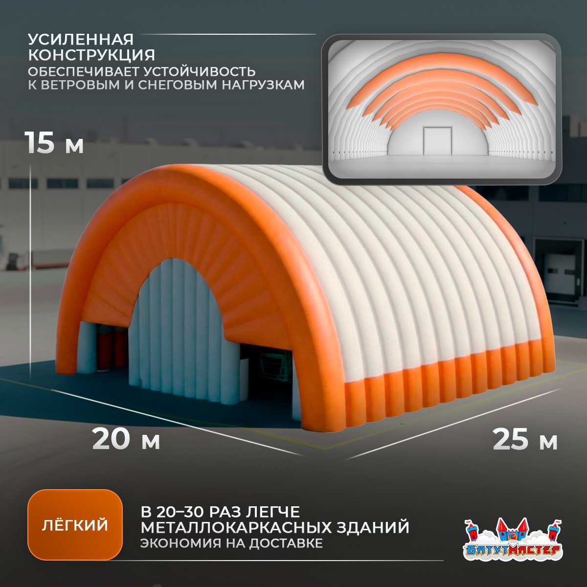 Модель «Фабрика Движения» 25x20x15 м создана для промышленного производства, логистики, ремонтных баз и добывающей отрасли. Это полноценное рабочее пространство большого объема, которое можно развернуть в кратчайшие сроки и использовать круглый год.
