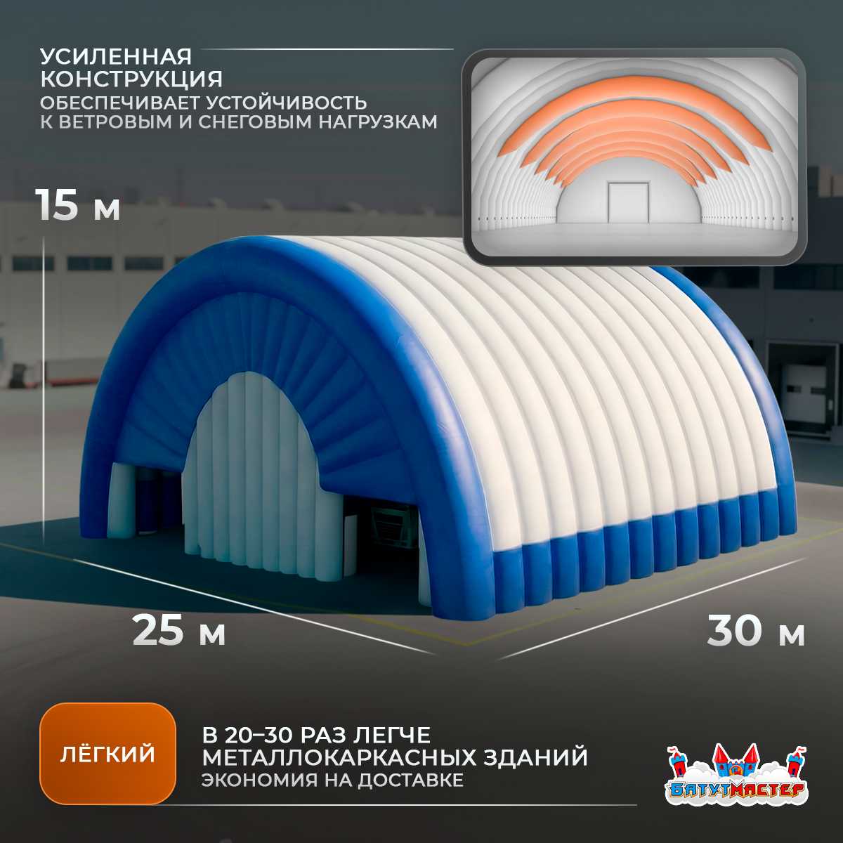 Пневмоангар «Заводская База» 30x25x15 — это пространство для производства, логистики и сервисных баз, которое запускается за 1–3 дня и начинает работать на прибыль практически сразу.