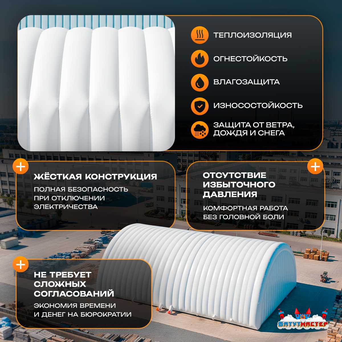 Каркас состоит из пневматических баллонов, формирующих жёсткую арочную систему. Герметичная оболочка из армированного ПВХ полностью изолирует внутреннее пространство от внешних воздействий.
