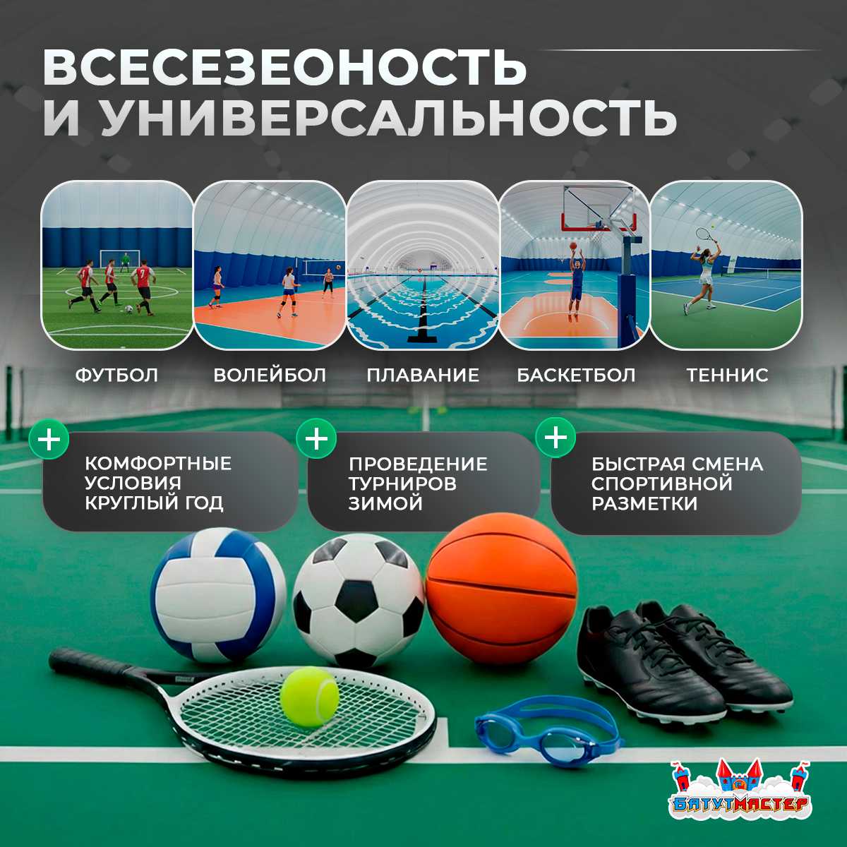 Это не просто укрытие, а современная спортивная инфраструктура, которая начинает работать на ваш бизнес уже через несколько дней после монтажа.