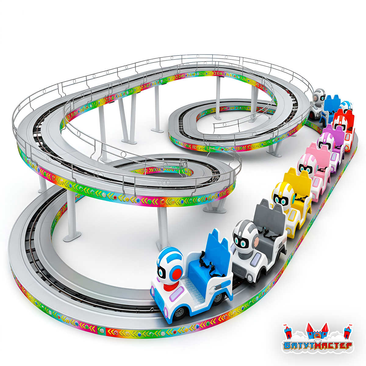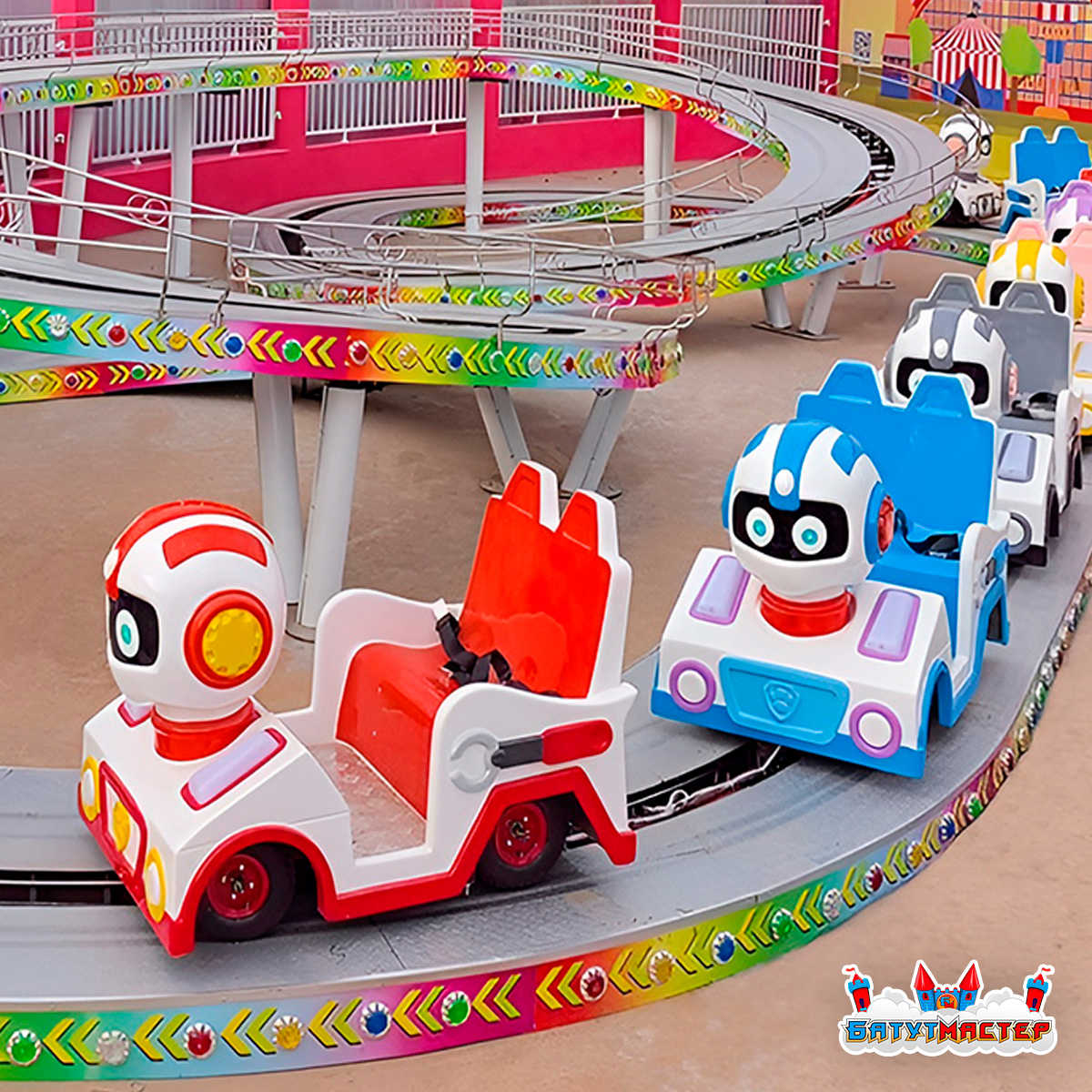 Американские горки «Цветные гонки» — это аттракцион, который мгновенно становится центром внимания. Красочные поезда в виде дружелюбных роботов создают атмосферу весёлого соревнования, а извилистая трасса превращает каждую поездку в маленькое приключение.