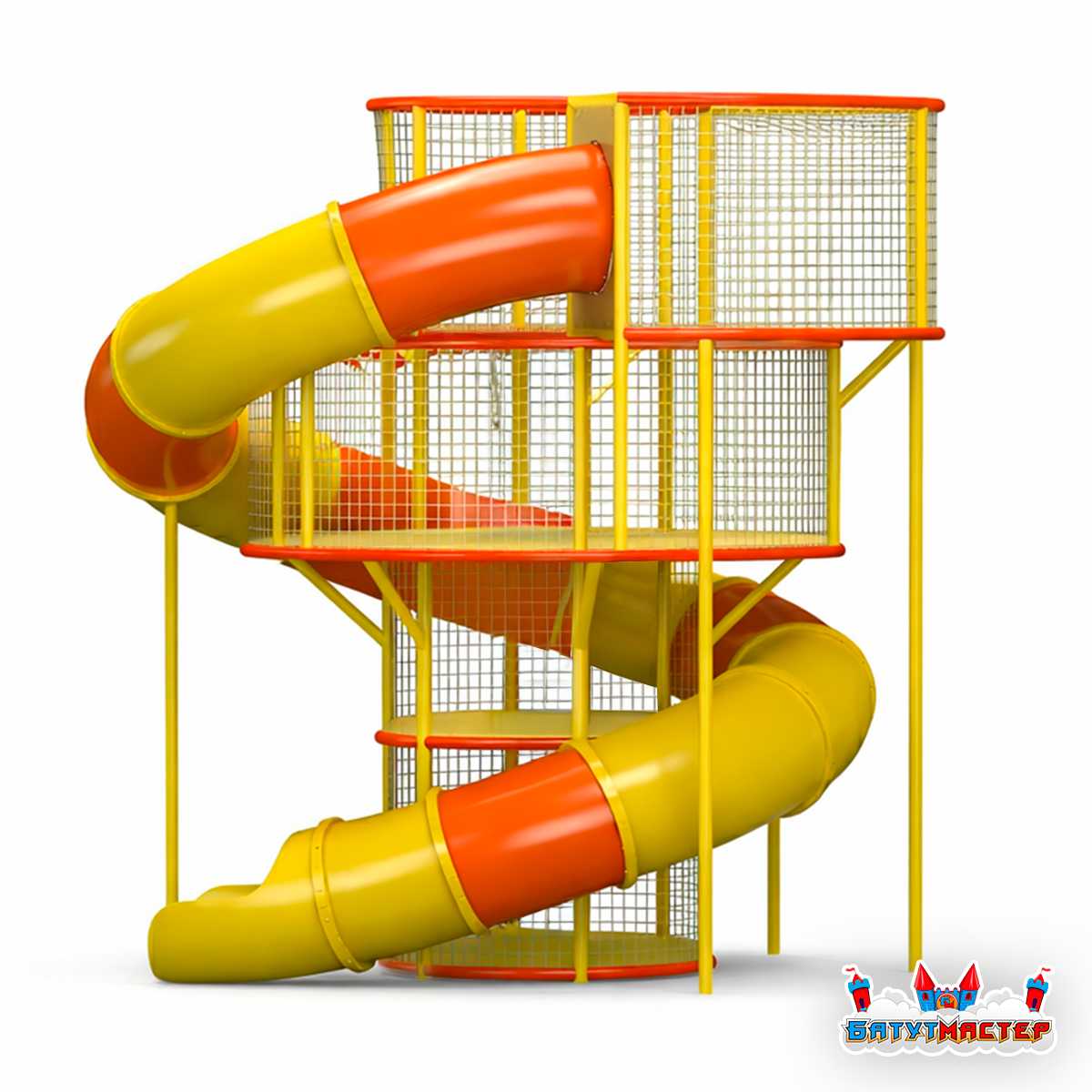 Сетчатые ограждения по периметру обеспечивают визуальную открытость и контроль, а закрытая трубчатая горка добавляет динамики и яркий финал игрового маршрута.
