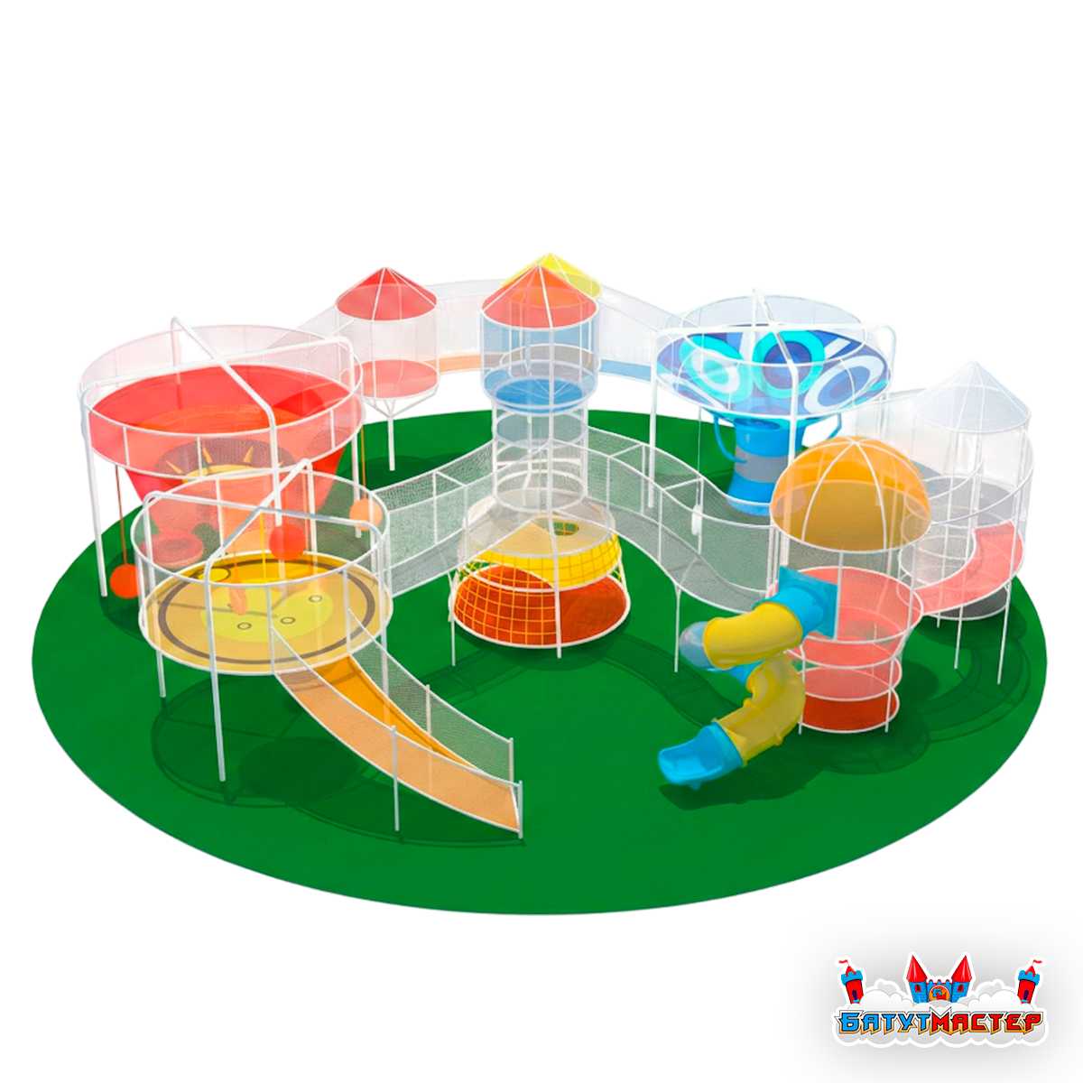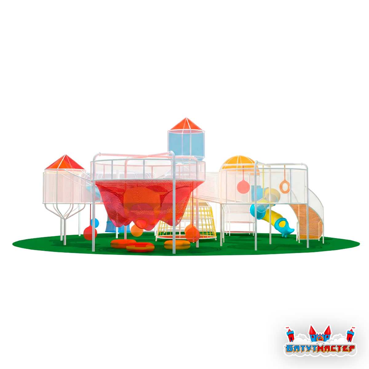 Основа аттракциона — прочный стальной каркас, обеспечивающий устойчивость всей системы даже при высокой нагрузке. Металлические элементы защищены и закрыты, формируя безопасную среду для активной игры.
