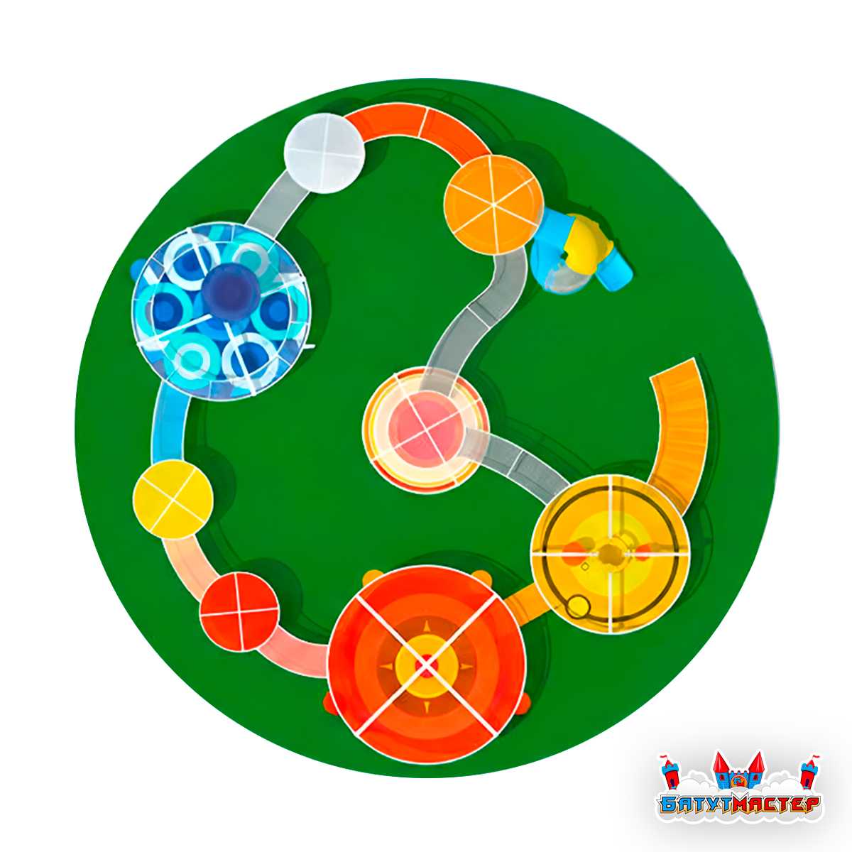 Башня формирует круговой маршрут с переходами между разными уровнями. Ребёнок может выбрать путь через тоннель, пройти по сетчатому мосту или подняться по вертикальному маршруту на следующий этаж.