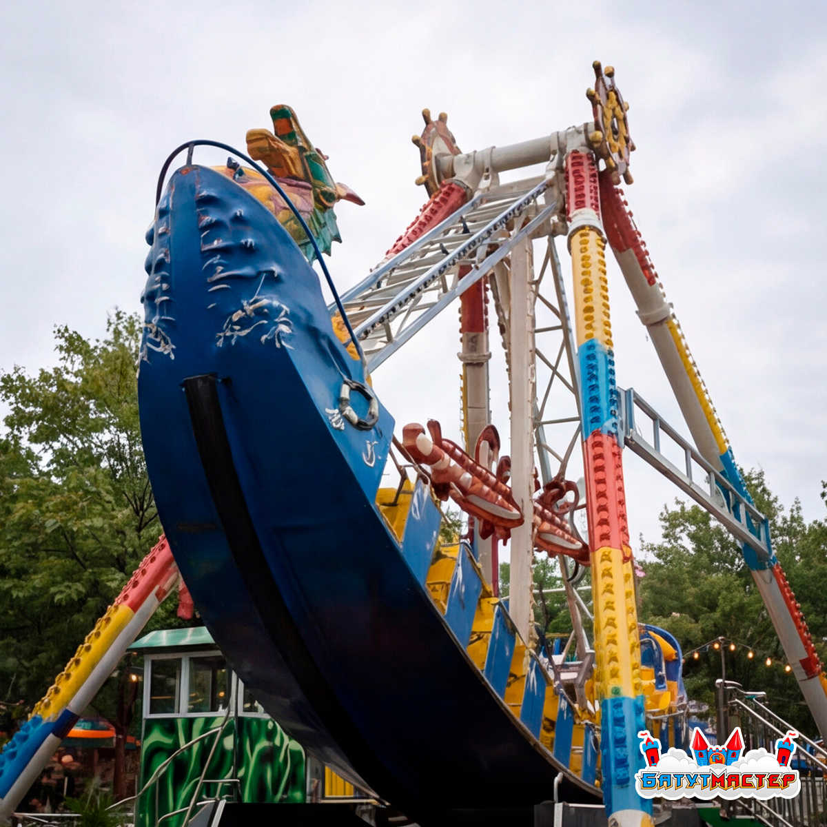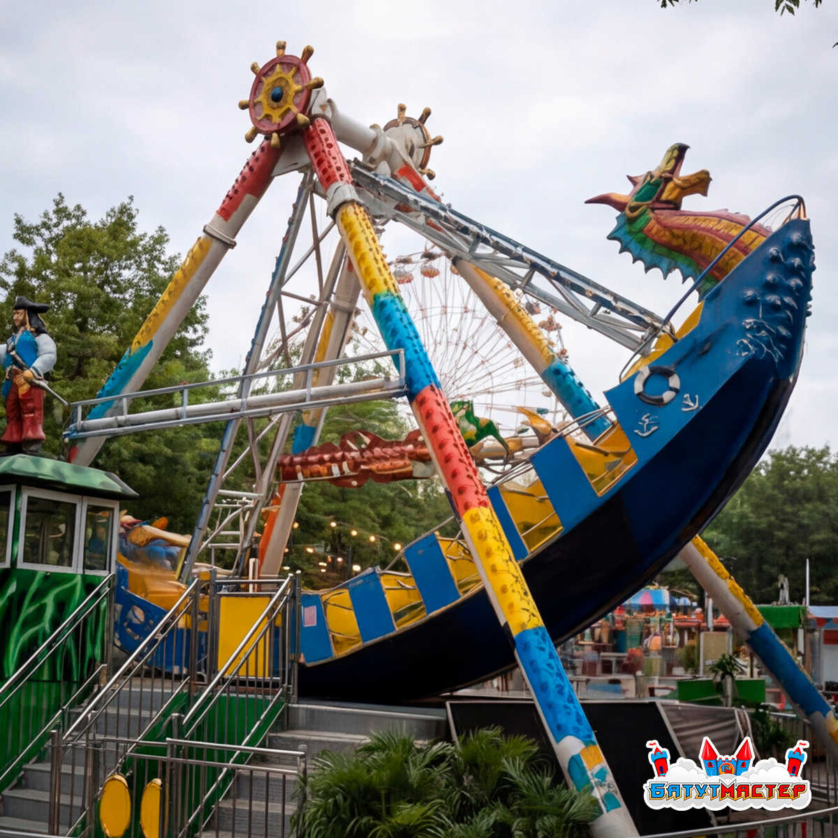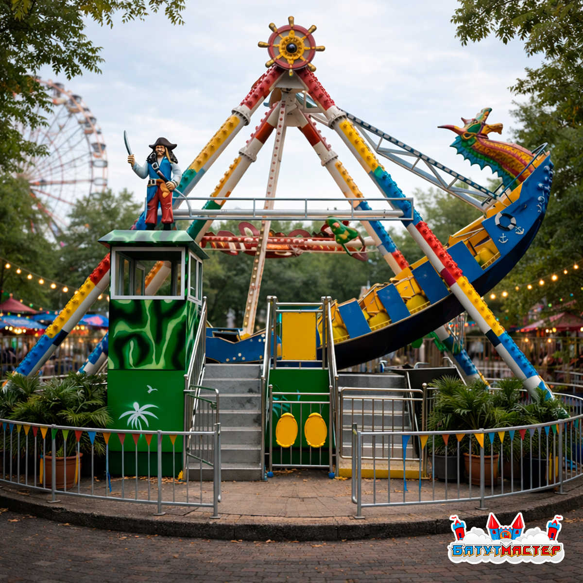 Аттракцион изготавливается в ярком морском стиле с декоративными элементами, включая фигуру капитана, насыщенную подсветку и динамичный корпус корабля. Благодаря этому он легко становится визуальным центром любой развлекательной площадки.