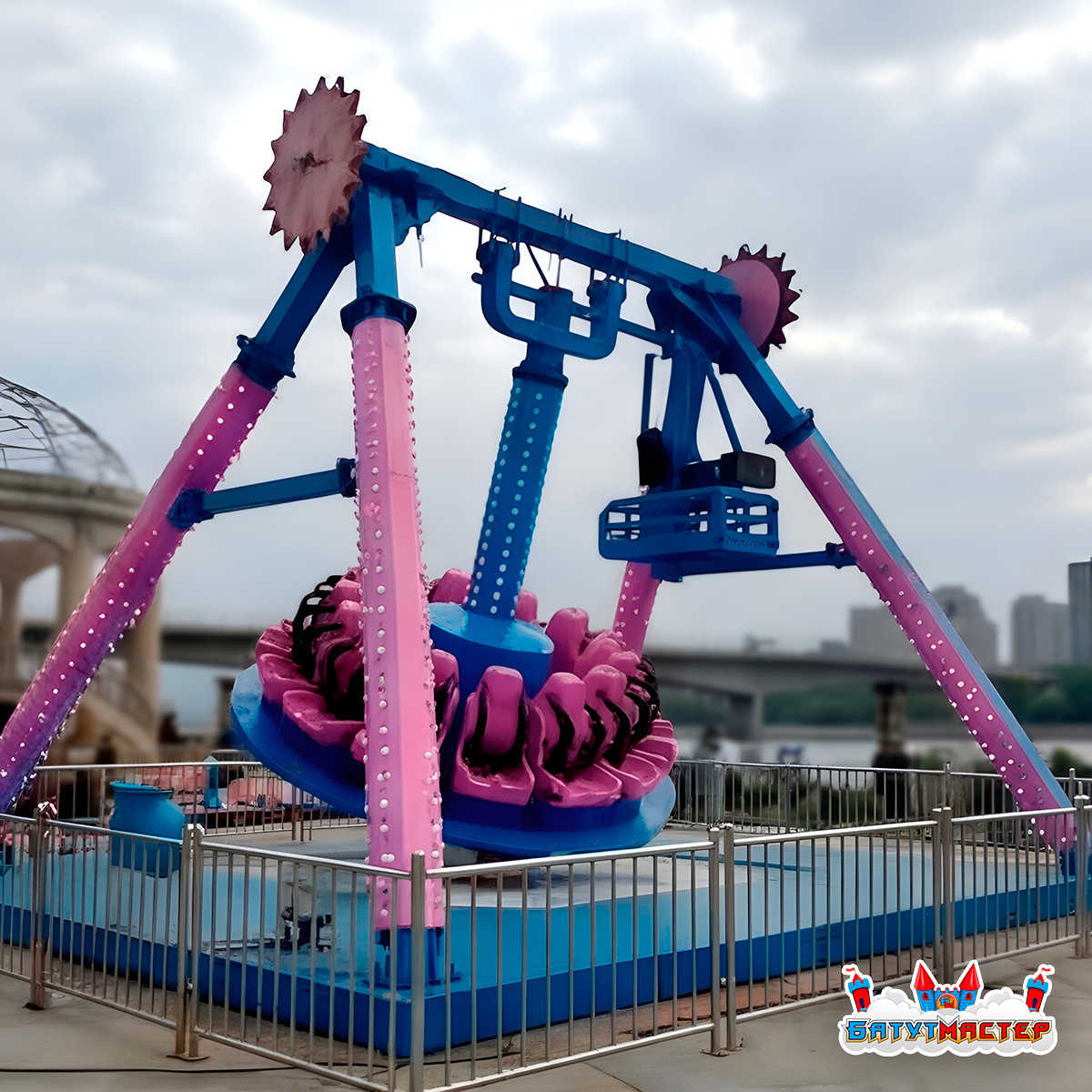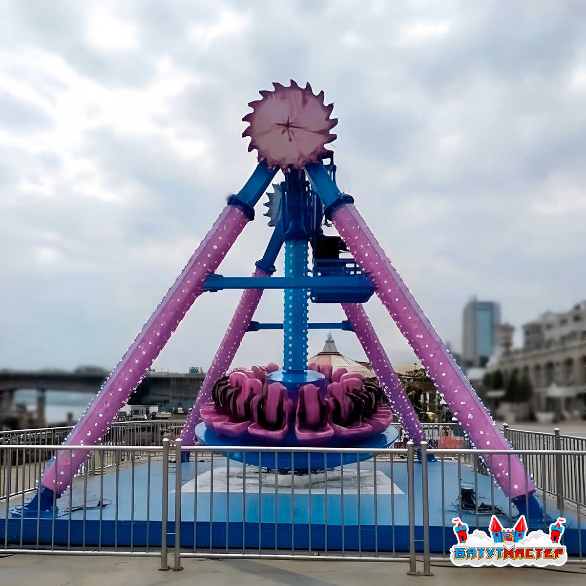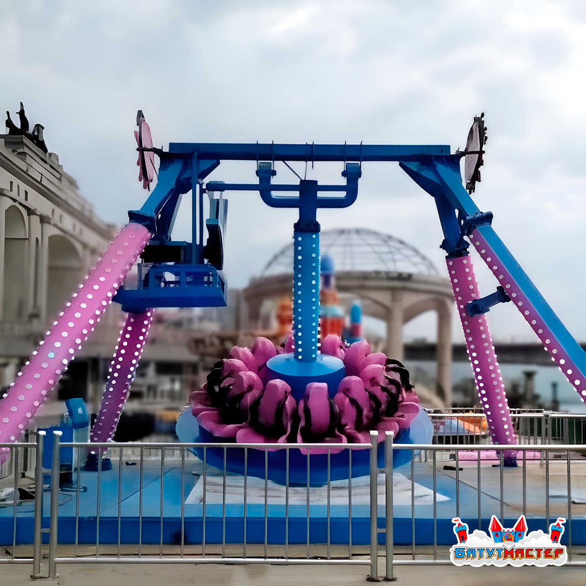 Пятый элемент аттракцион «Розовый Лотос» — это эффектный коммерческий объект, созданный для интенсивной эксплуатации в парках развлечений, на курортах и в городских зонах отдыха. Конструкция высотой 7,5 м формирует выразительный силуэт, заметный издалека, а габариты 15x12 м позволяют организовать удобную зону ожидания и безопасное пространство вокруг аттракциона.