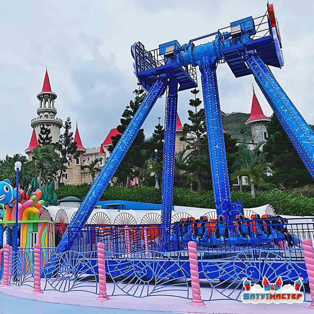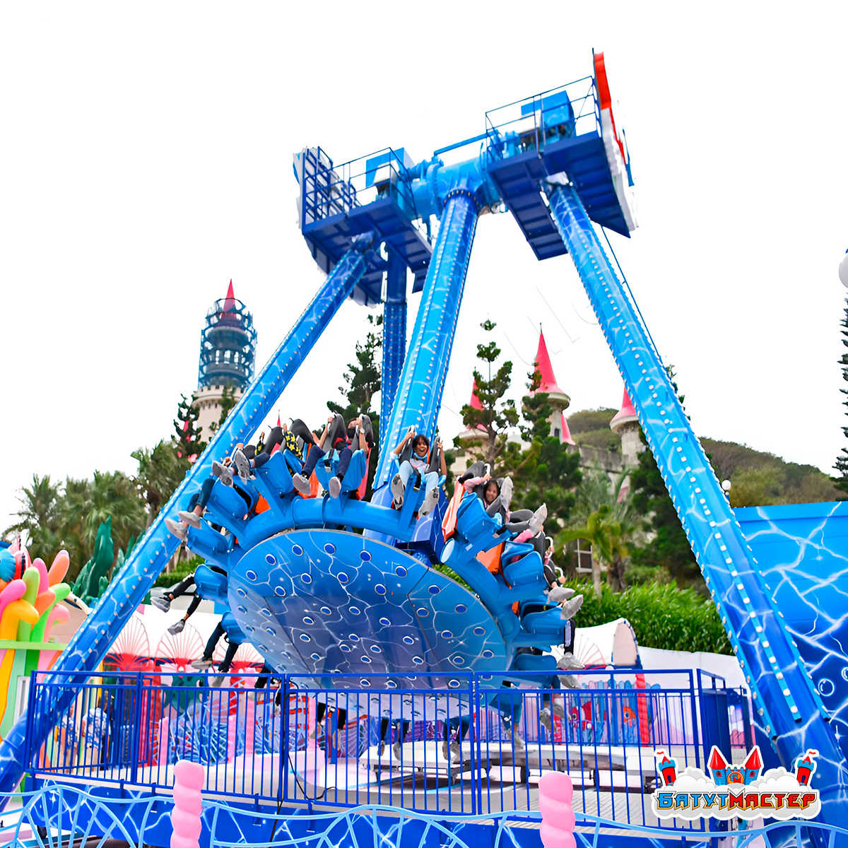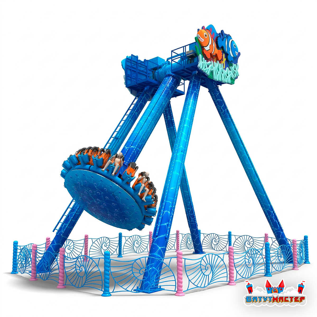 Аттракцион тарелка «Морской Прилив» — это масштабная динамическая конструкция высотой 19 метров и габаритами 19x15x15 м, которая формирует визуальную доминанту любой развлекательной территории. Морская тематика с яркими декоративными элементами в виде подводных персонажей создаёт запоминающийся образ и усиливает эмоциональное вовлечение гостей.