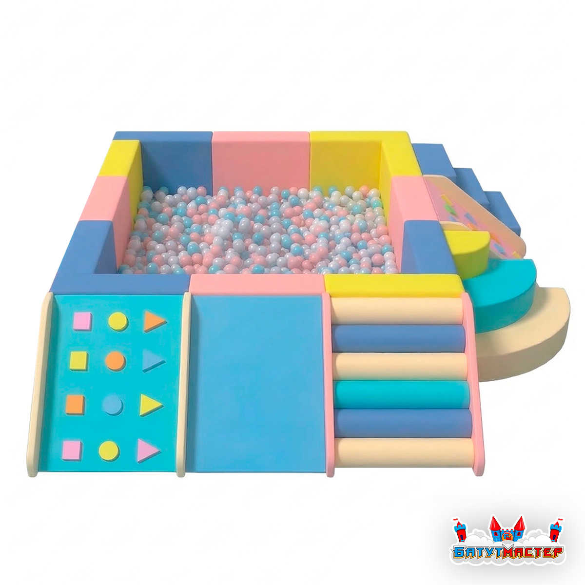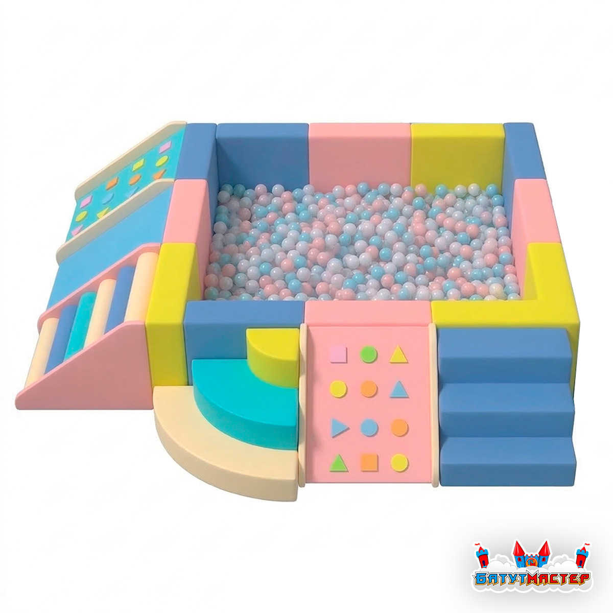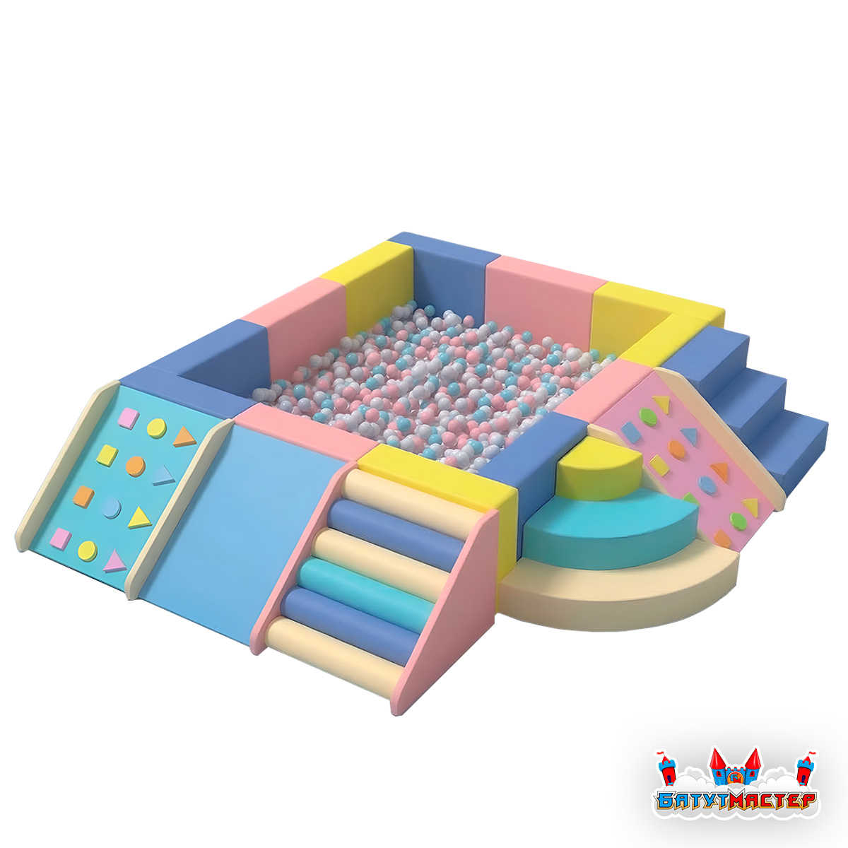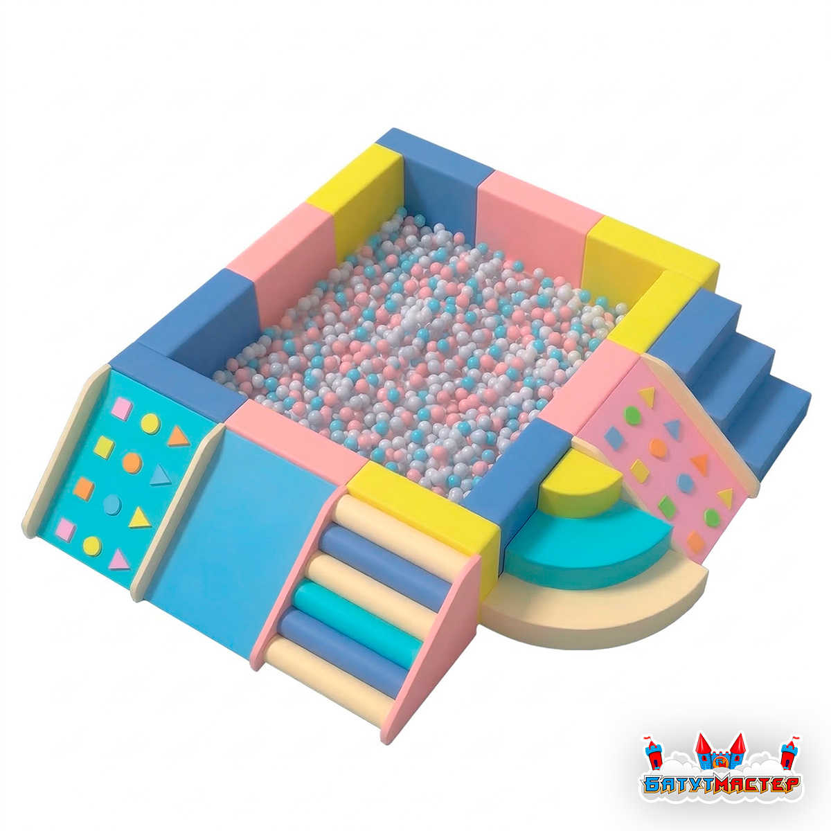 Дизайн модели дополнен мягкими горками, ступенями как стандартными, так и с геометрическими элементами. Ребёнок не просто заходит внутрь — он проходит маленькое приключение: поднимается по ступеням, спускается с горки, исследует формы, а затем с восторгом ныряет в шарики. Такое решение усиливает вовлечённость и делает игровой процесс более разнообразным.