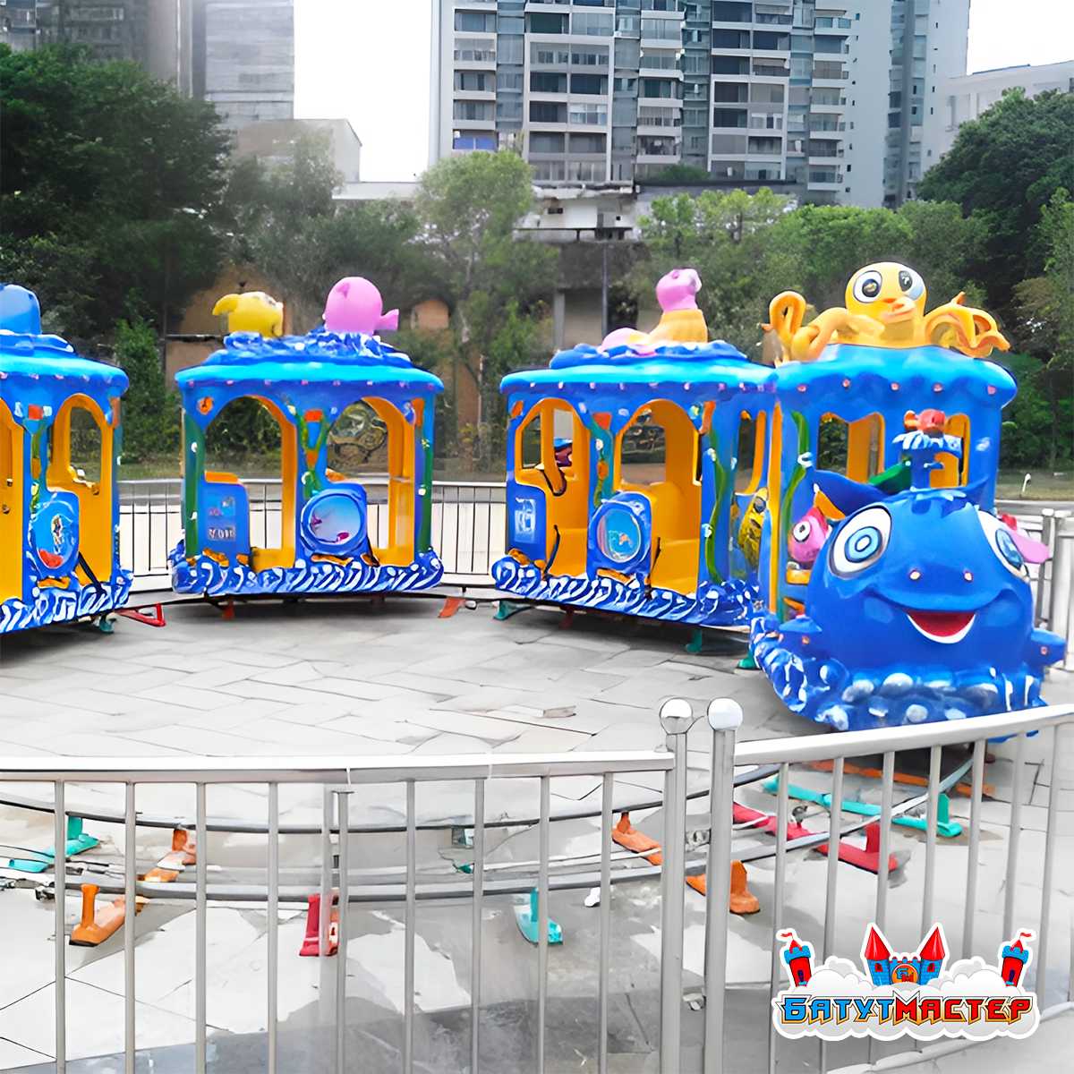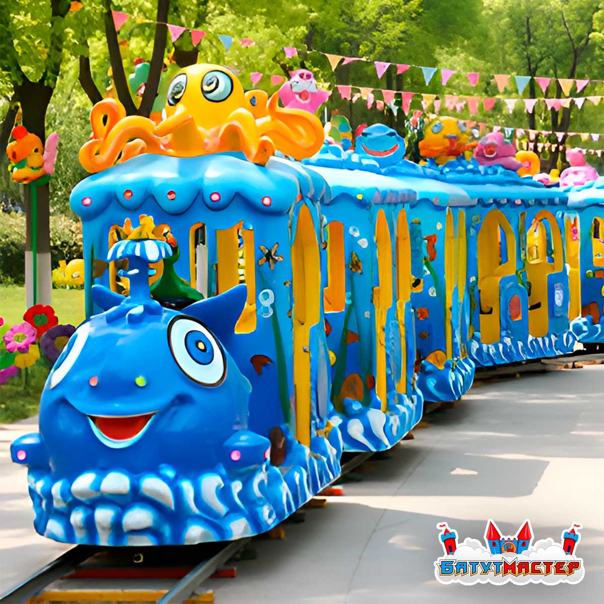 Рельсовый поезд «Капитан Кит» — это не просто аттракцион, а полноценный визуальный магнит для любой развлекательной площадки. Морская тематика с дружелюбным китом и подводными персонажами формирует яркий эмоциональный фон, который сразу привлекает внимание детей и взрослых.