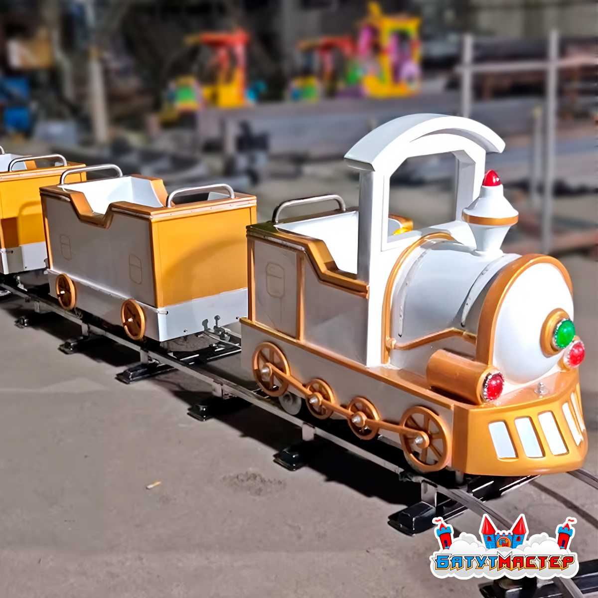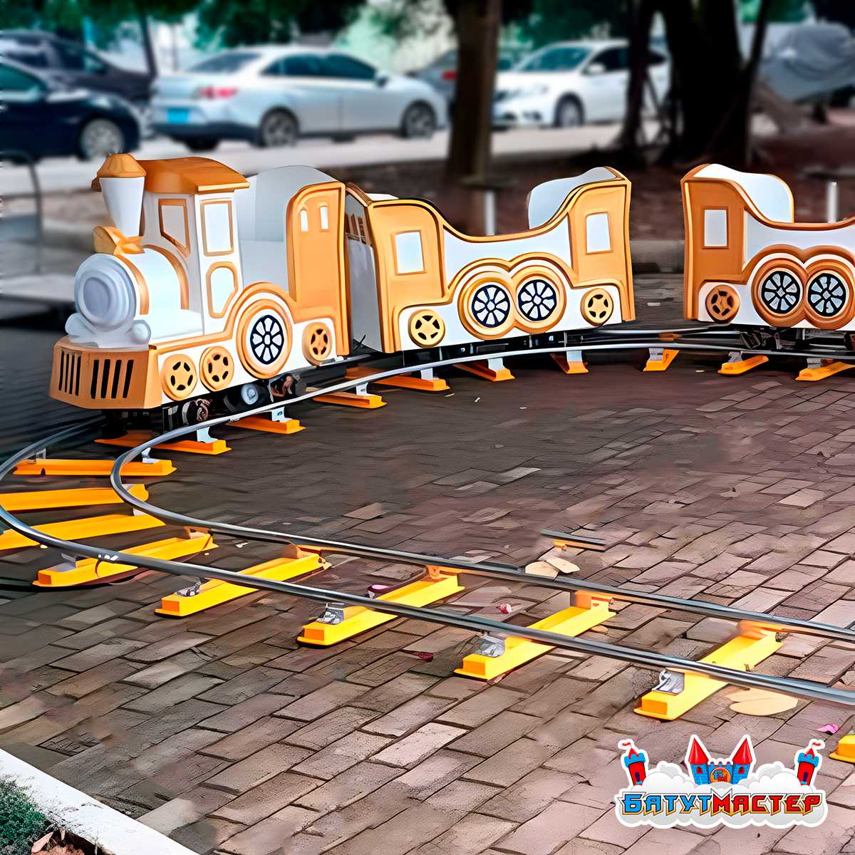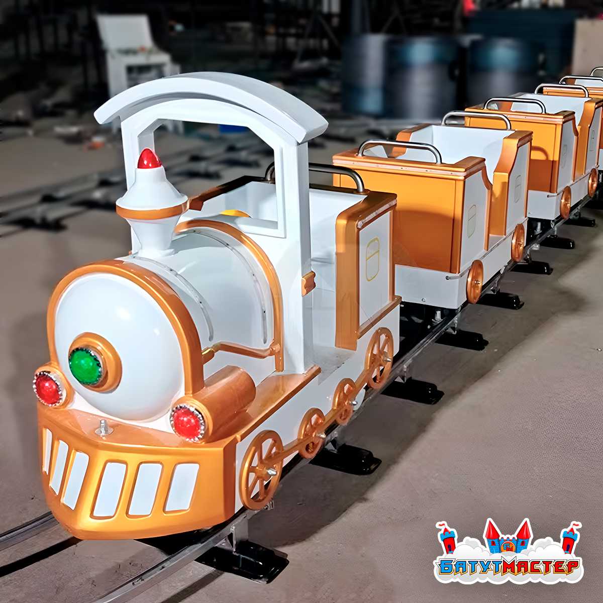 Формат рельсовой железной дороги обеспечивает устойчивость конструкции и плавность движения. Посадка и высадка организованы удобно благодаря продуманной высоте элементов. Аттракцион ориентирован на детскую аудиторию и рассчитан на комфортное использование в условиях постоянного потока посетителей.