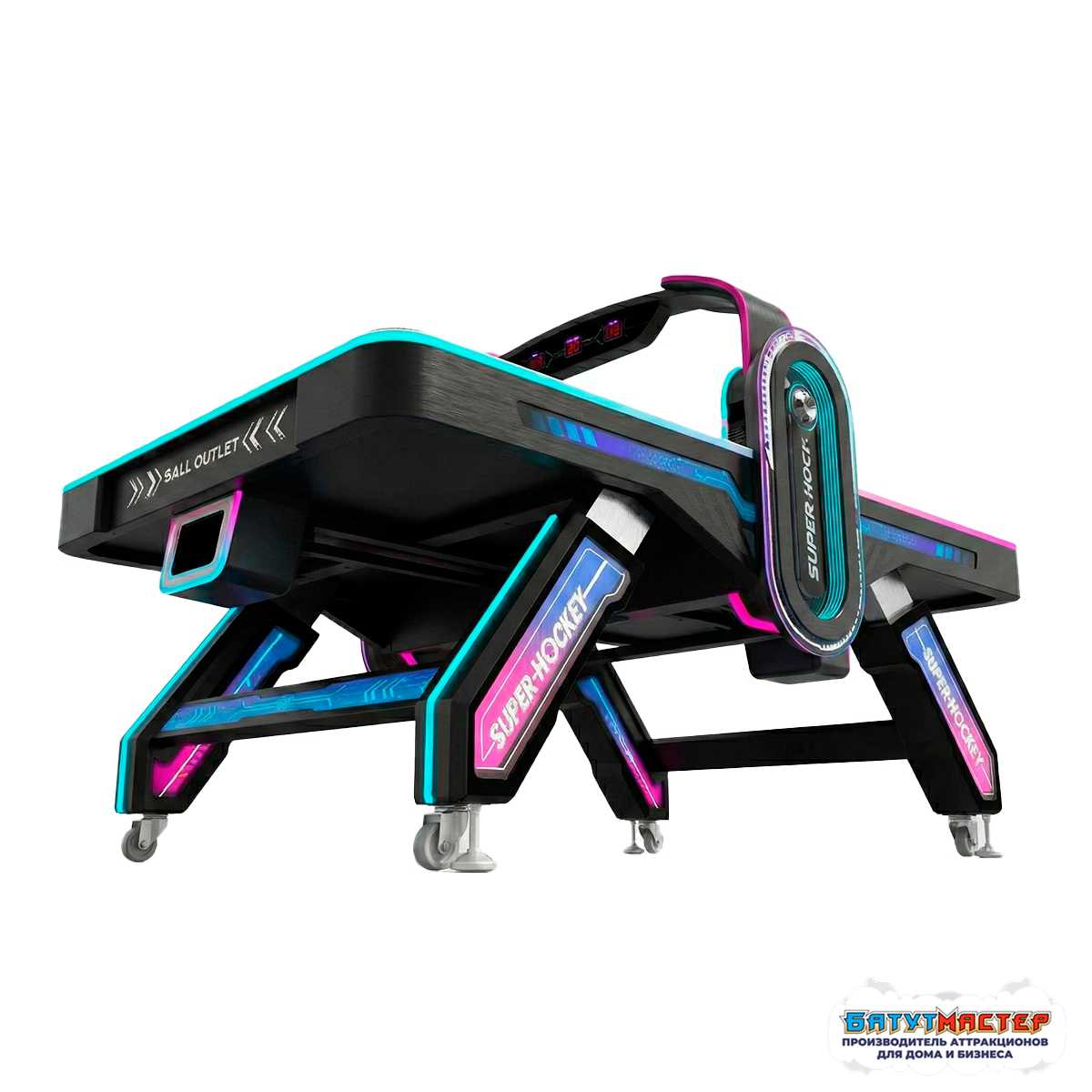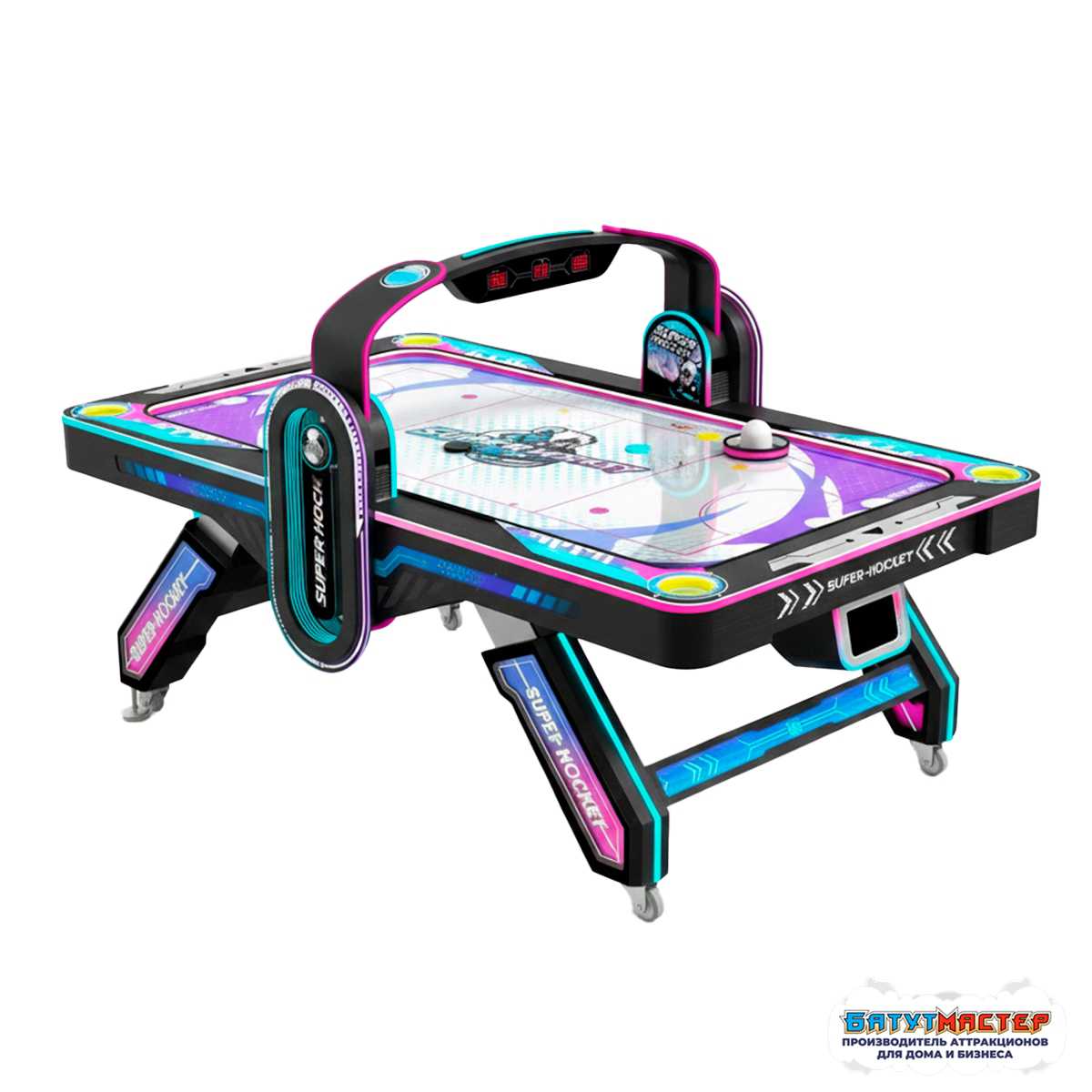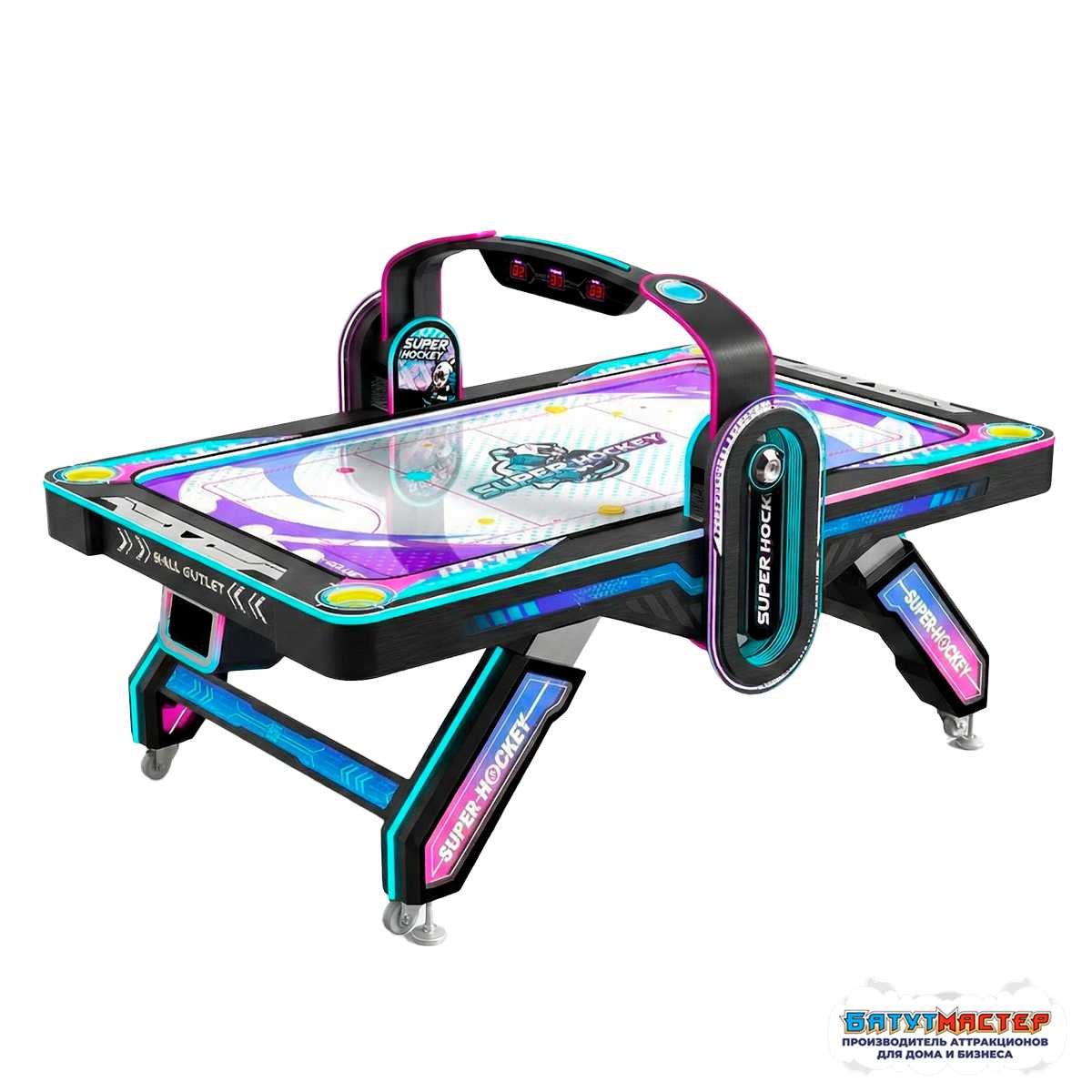Модель выполнена в эксклюзивной тематике с яркими графическими элементами и подсветкой корпуса. Неоновое оформление усиливает ощущение современного пространства и делает аэрохоккей фотогеничной зоной, рядом с которой родители с удовольствием делают снимки детей 📸