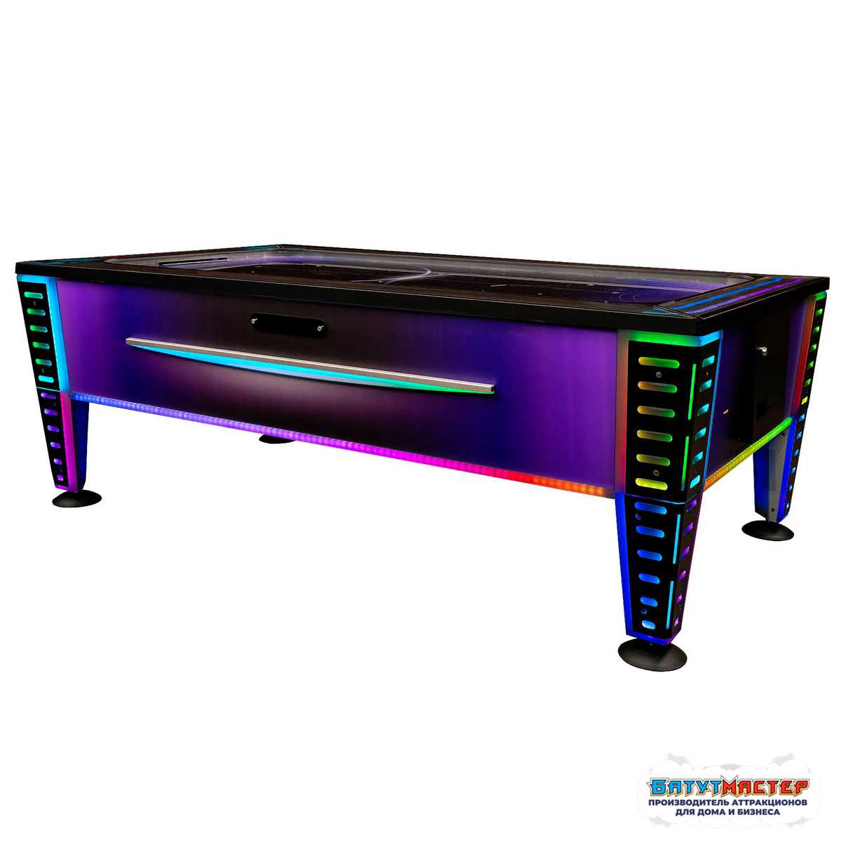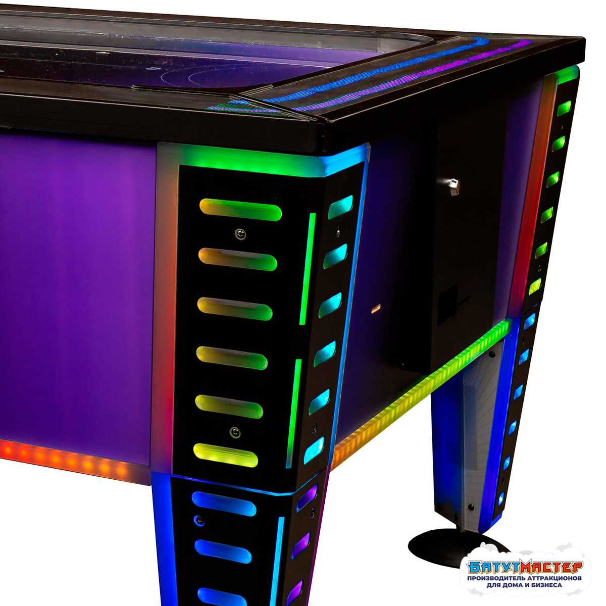 Подсветка корпуса и пола создаёт яркий визуальный акцент в пространстве. Световые элементы усиливают впечатление от игры и делают аэрохоккей заметным даже в насыщенной игровой среде.