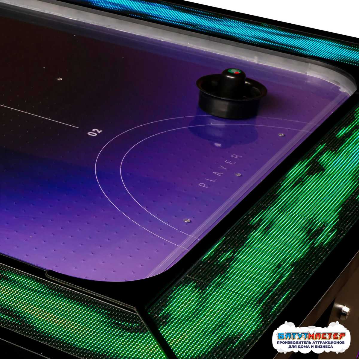 Модель рассчитана на регулярную нагрузку в условиях интенсивного потока посетителей. Игровое поле выполнено из материалов с низким трением, обеспечивающих стабильное скольжение шайбы. Бортики ограничивают игровую зону и помогают удерживать шайбу внутри поля даже при активной игре.