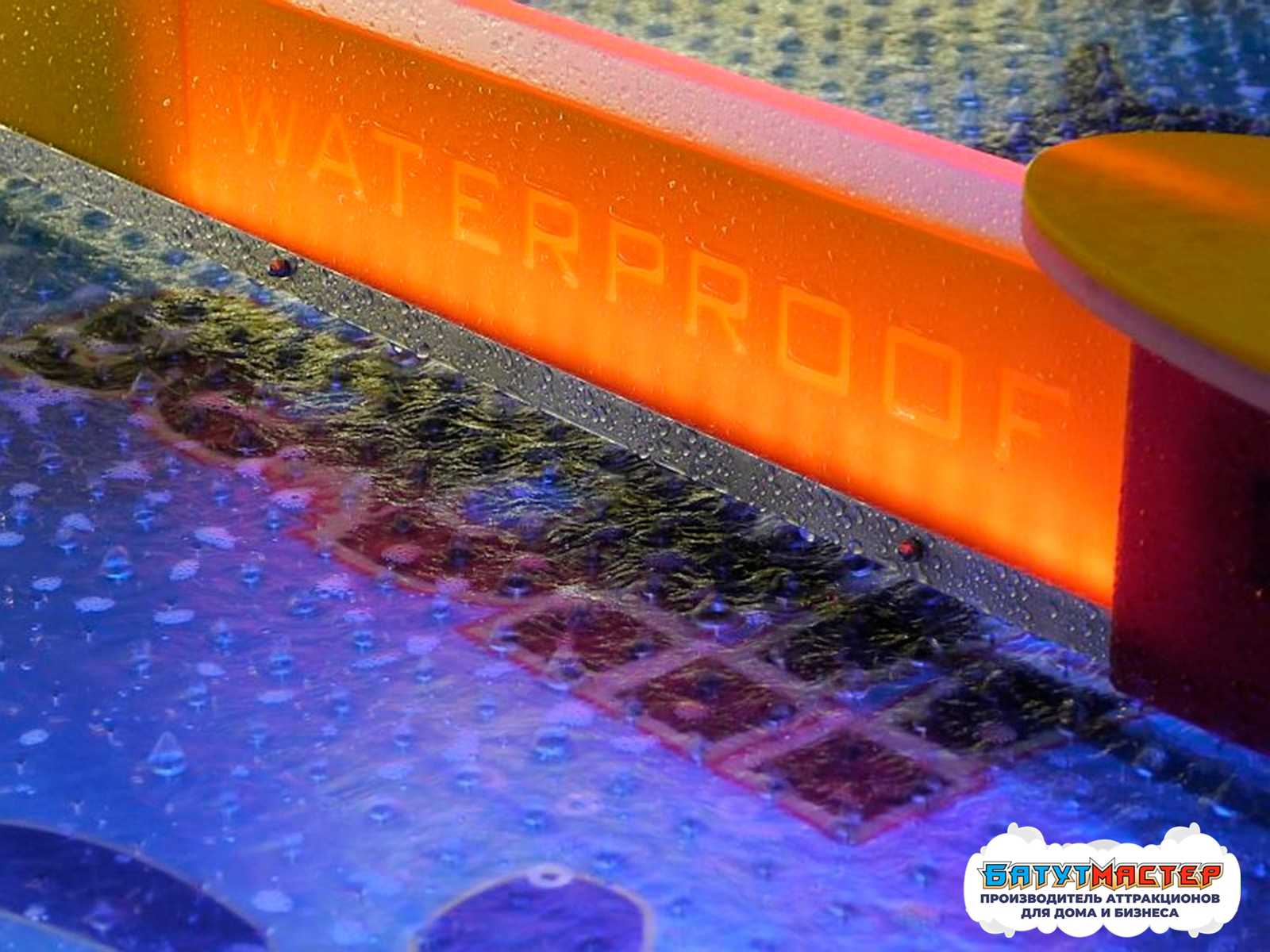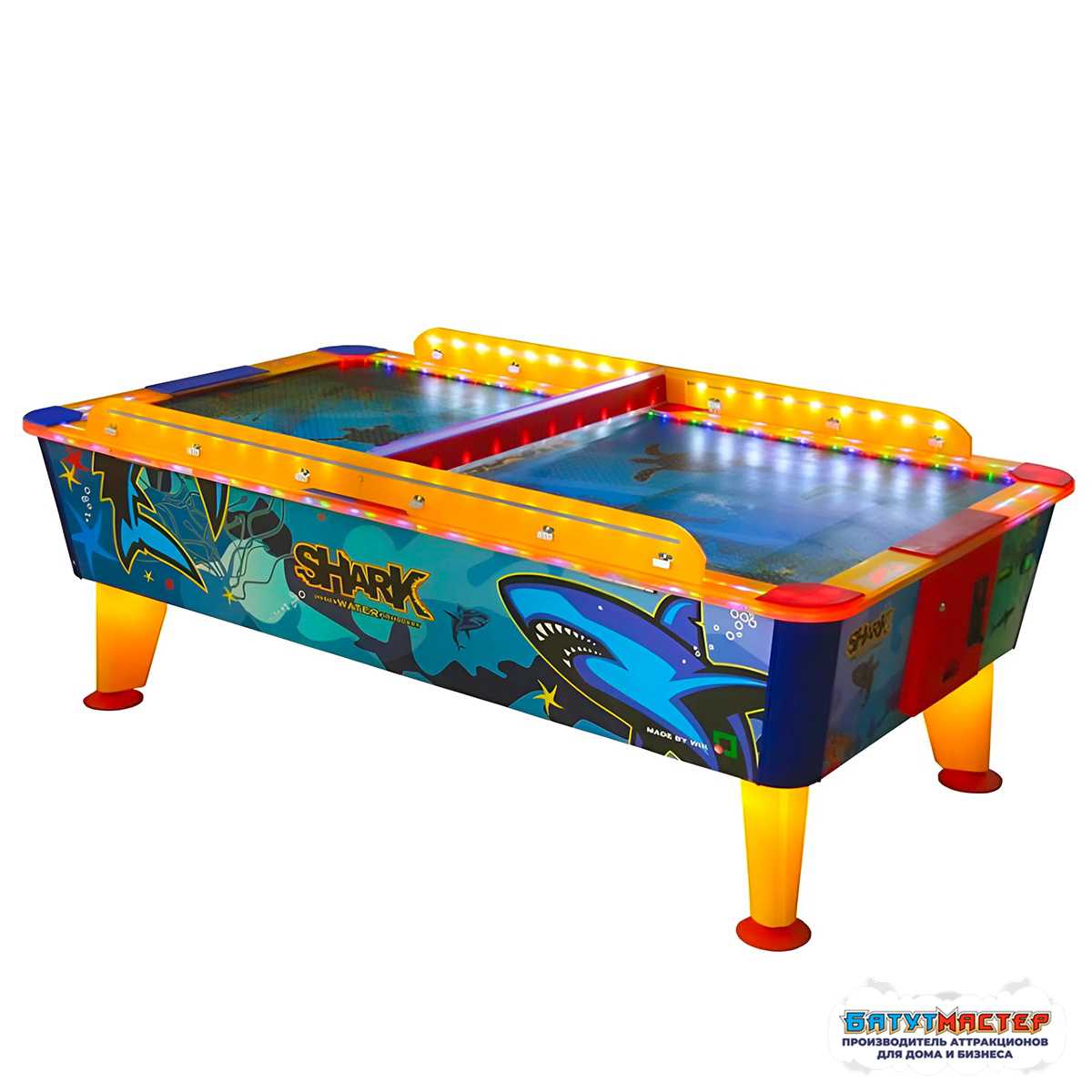 Большой аэрохоккей «Шторм» для игровой зоны оформлен в морской стилистике с яркими изображениями подводного мира. Глубокие синие оттенки, динамичные морские персонажи и световые элементы создают ощущение настоящего океанского приключения. Подсветка корпуса усиливает визуальный эффект и делает оборудование заметным даже в насыщенном игровом пространстве.