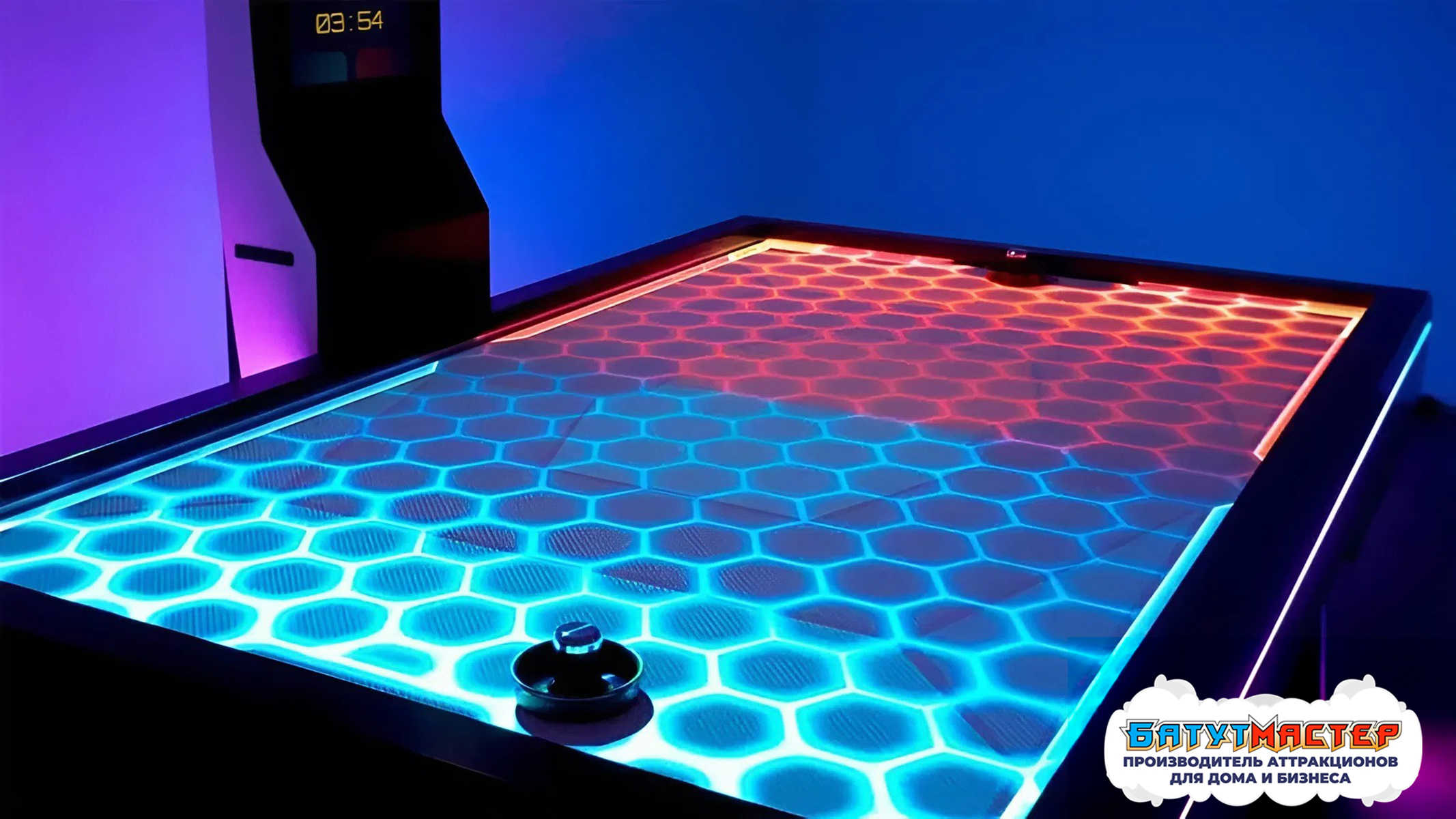 Игровая поверхность превращается в светящуюся арену, где классическая механика аэрохоккея сочетается с современными технологиями. Дети видят не просто шайбу и ворота, а целое мини-представление, в котором они становятся главными участниками.