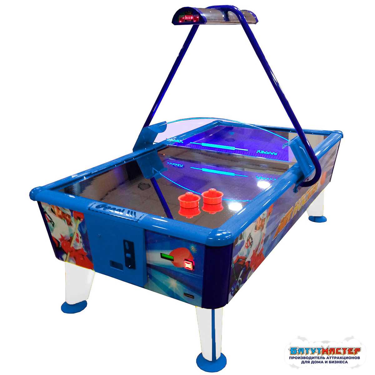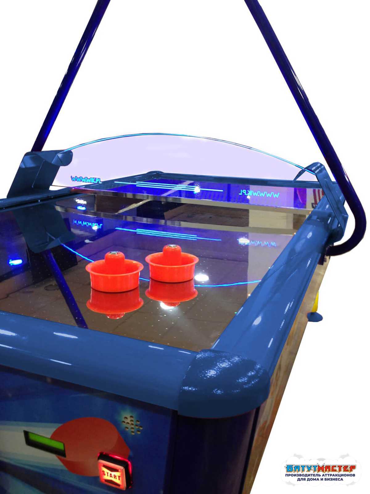 Игровое поле работает по принципу воздушной подушки: шайба легко и быстро скользит по поверхности, создавая динамичный темп игры. Формат рассчитан на двух игроков — идеально для семейных поединков.