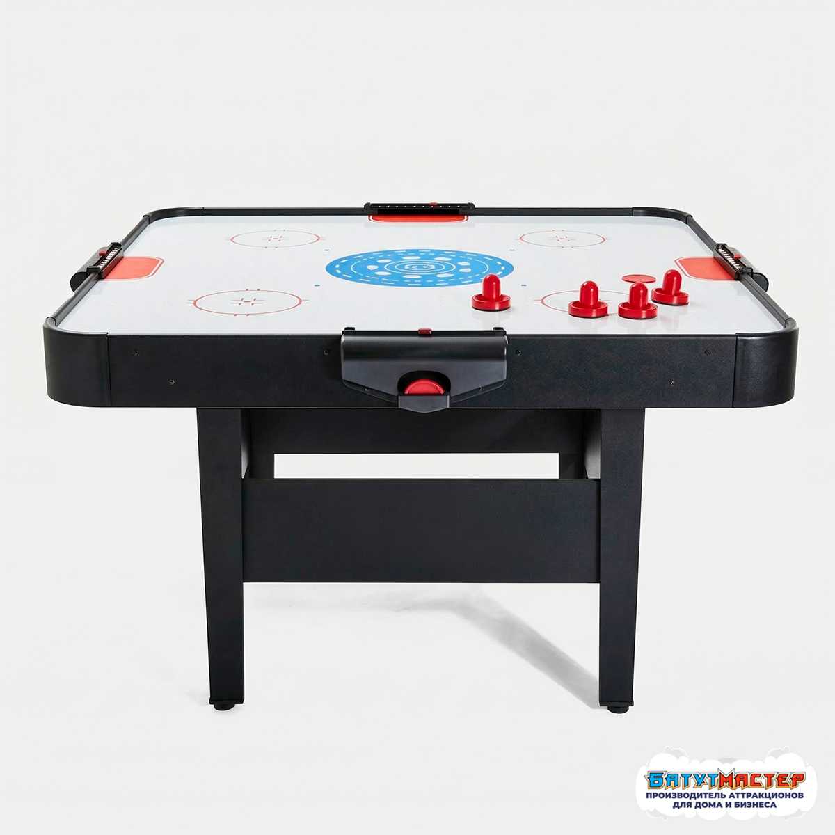 Игровое поле выполнено из прочных материалов с гладким покрытием, устойчивым к активной эксплуатации. Бортики надёжно ограничивают зону игры и предотвращают вылет шайбы.
