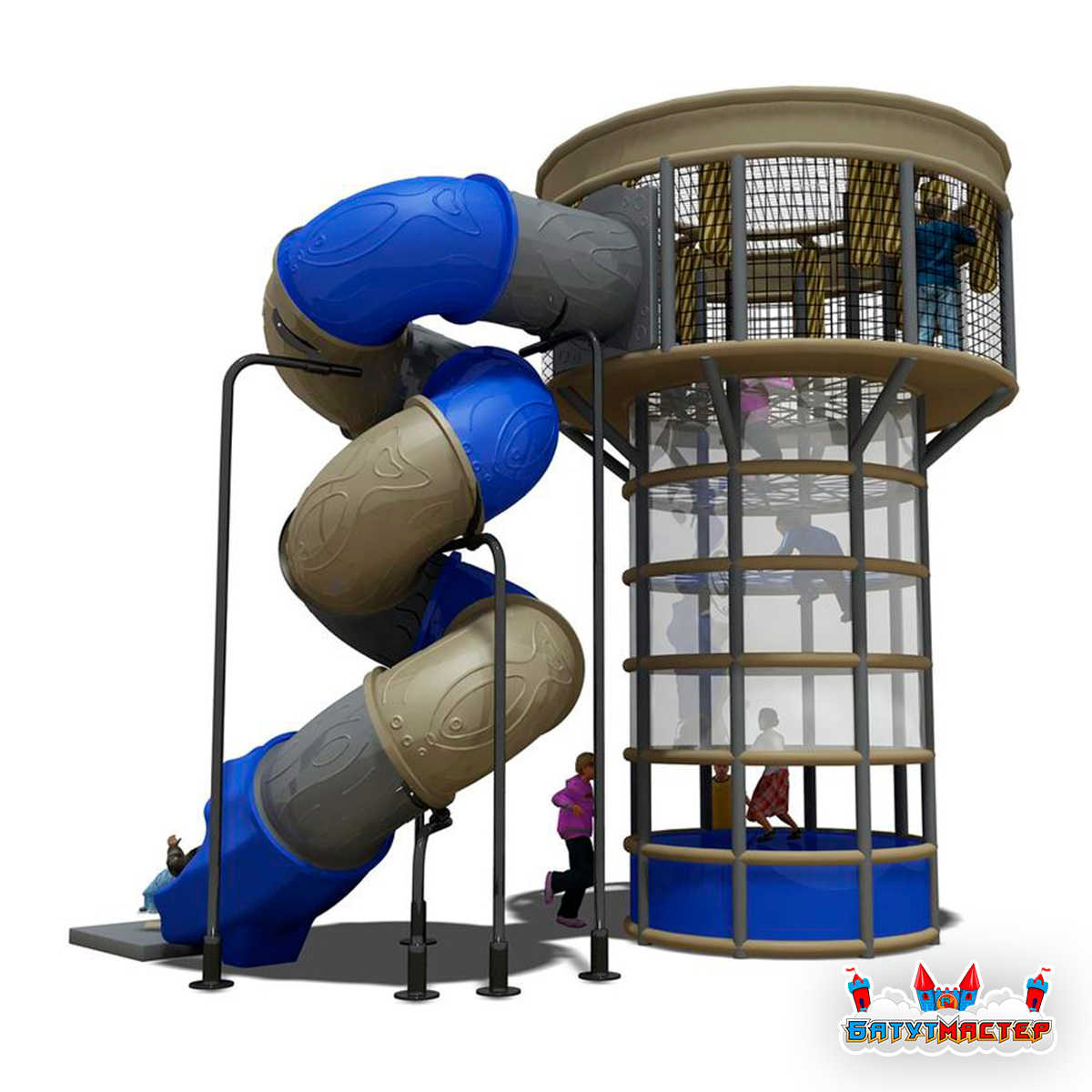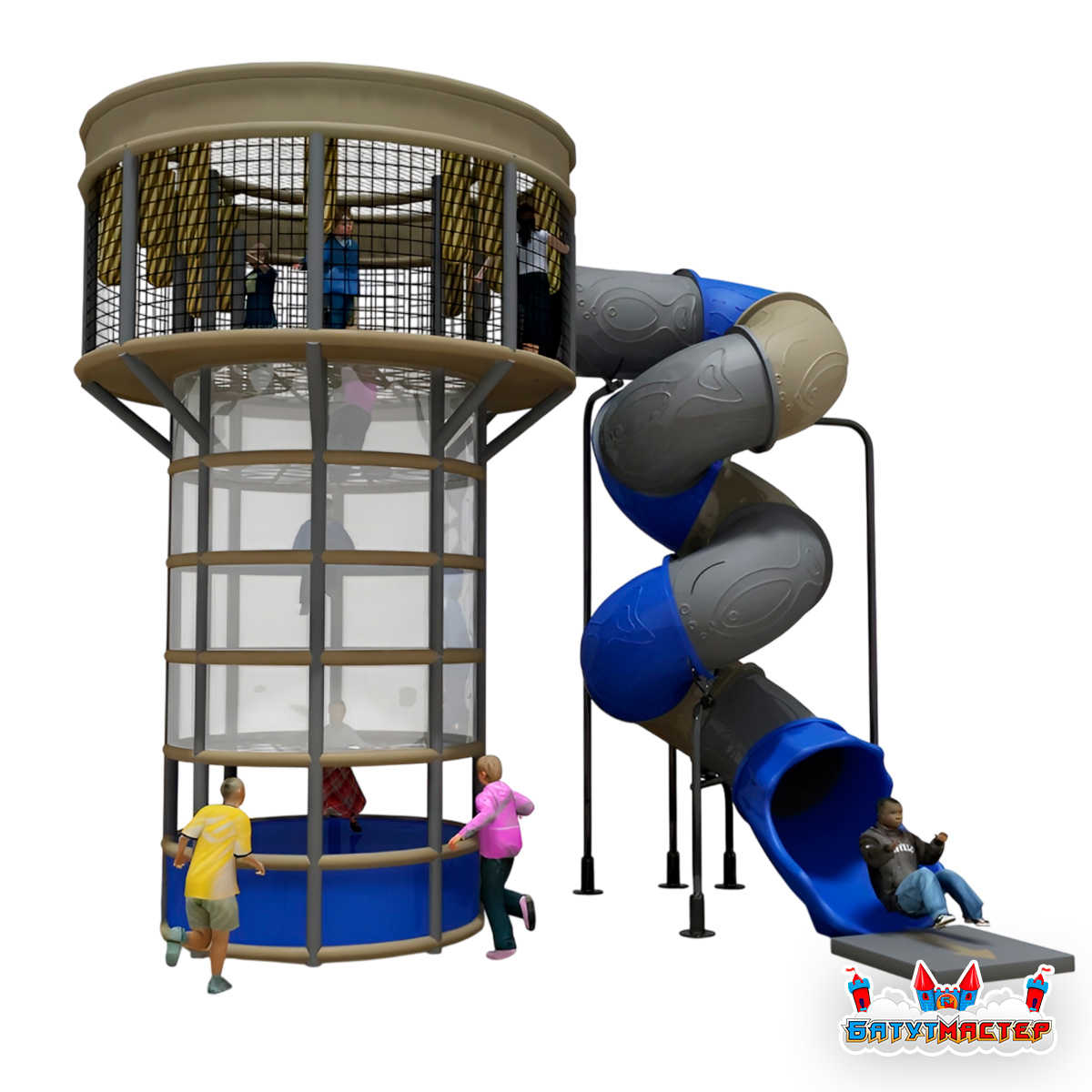 С первых секунд башня производит впечатление: многоэтажная структура, закрытая сетками, переходы, внутренние платформы и спуск по винтовой горке создают ощущение настоящего приключения. Для ребёнка — это покорение высоты. Для бизнеса — мощный магнит внимания.