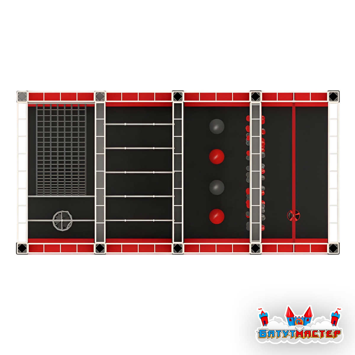 Формат 12x6 метров оптимален для средних и крупных площадок, а высота 3 метра позволяет разместить комплекс в помещениях со стандартными потолками.