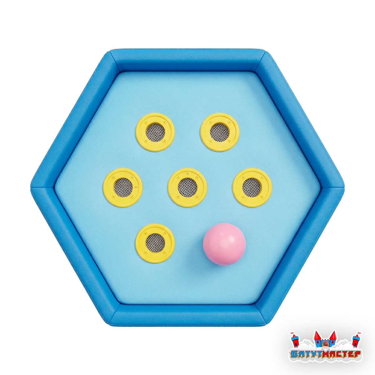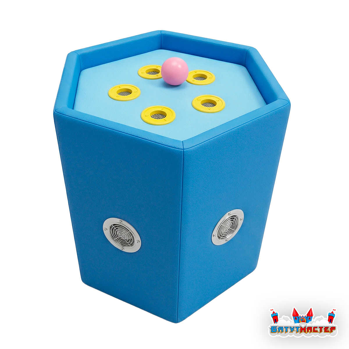 Воздушный фонтан «Фейерверк» изготавливается в форме компактной шестигранной колонны размером 0,6×0,6×0,8 метра. Такие габариты позволяют разместить устройство даже в небольшом сухом бассейне, при этом оставляя достаточно пространства для активной игры.
