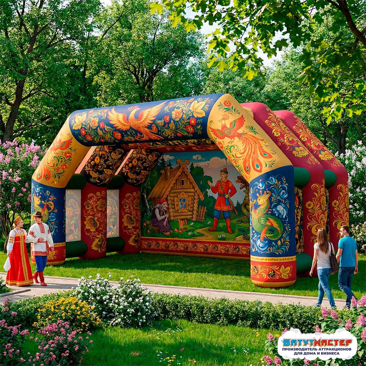 Представьте: ваши гости приходят на праздник и видят перед собой не обычную сцену, а настоящий сказочный терем, словно сошедший со страниц любимых детских книг. Величественные жар-птицы расправляют огненные крылья, мудрый змей хранит древние тайны, а добрый молодец в красном кафтане приглашает в мир чудес. Именно такую атмосферу создаёт надувная сцена «Тридевятое царство» — уникальная конструкция размером 8×4×4 м, способная превратить любую площадку в волшебное пространство для незабываемых событий.