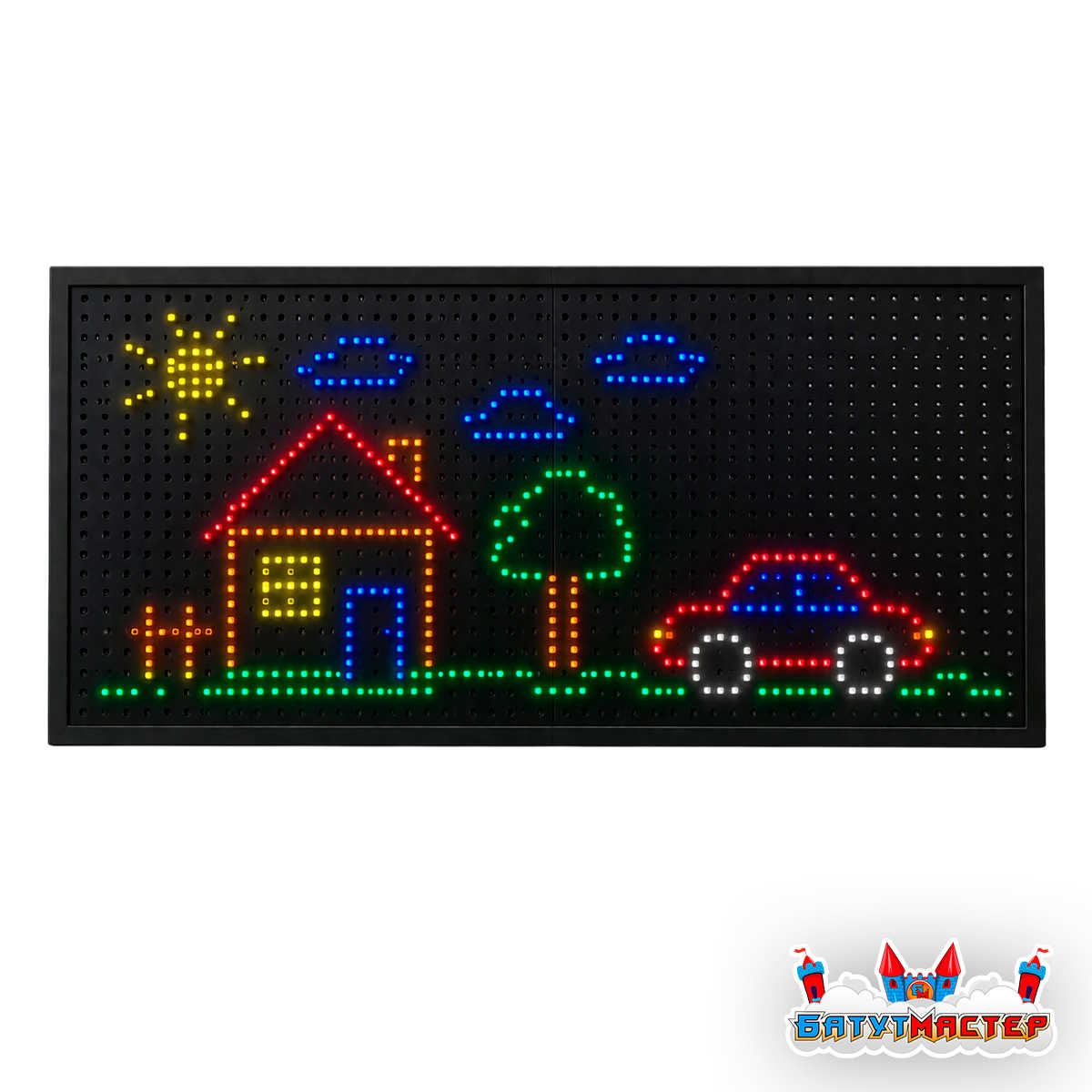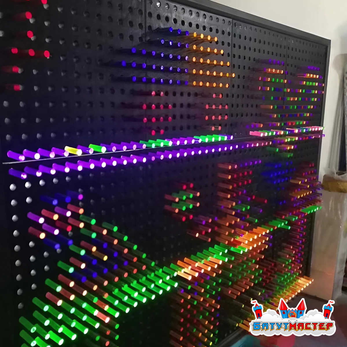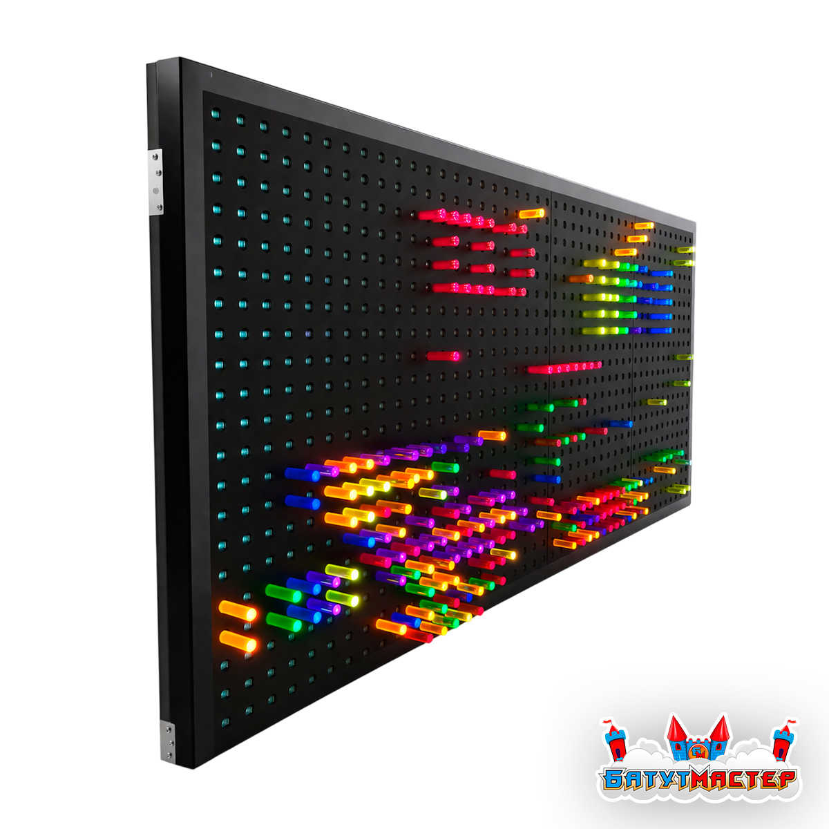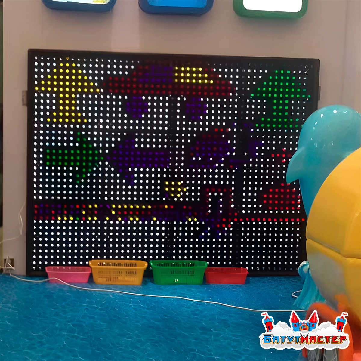 Конструкция устанавливается на собственном основании и не требует капитального крепления к стенам помещения. Для работы подсветки необходима розетка 220В. Рекомендуемое свободное пространство перед панелью — 1,5–2 м для комфортной игры.