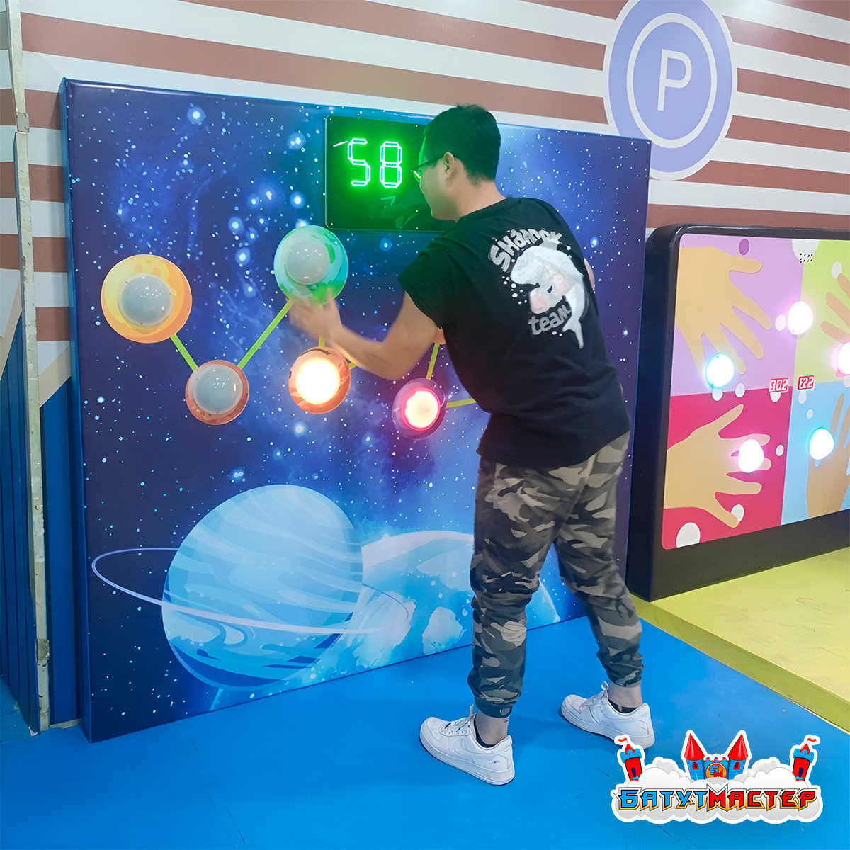 Электронное табло результатов. В верхней части стены установлен цифровой дисплей, который в реальном времени показывает набранные очки или оставшееся время. Дети обожают соревноваться друг с другом и бить собственные рекорды. Табло превращает каждую игровую сессию в мини-чемпионат.