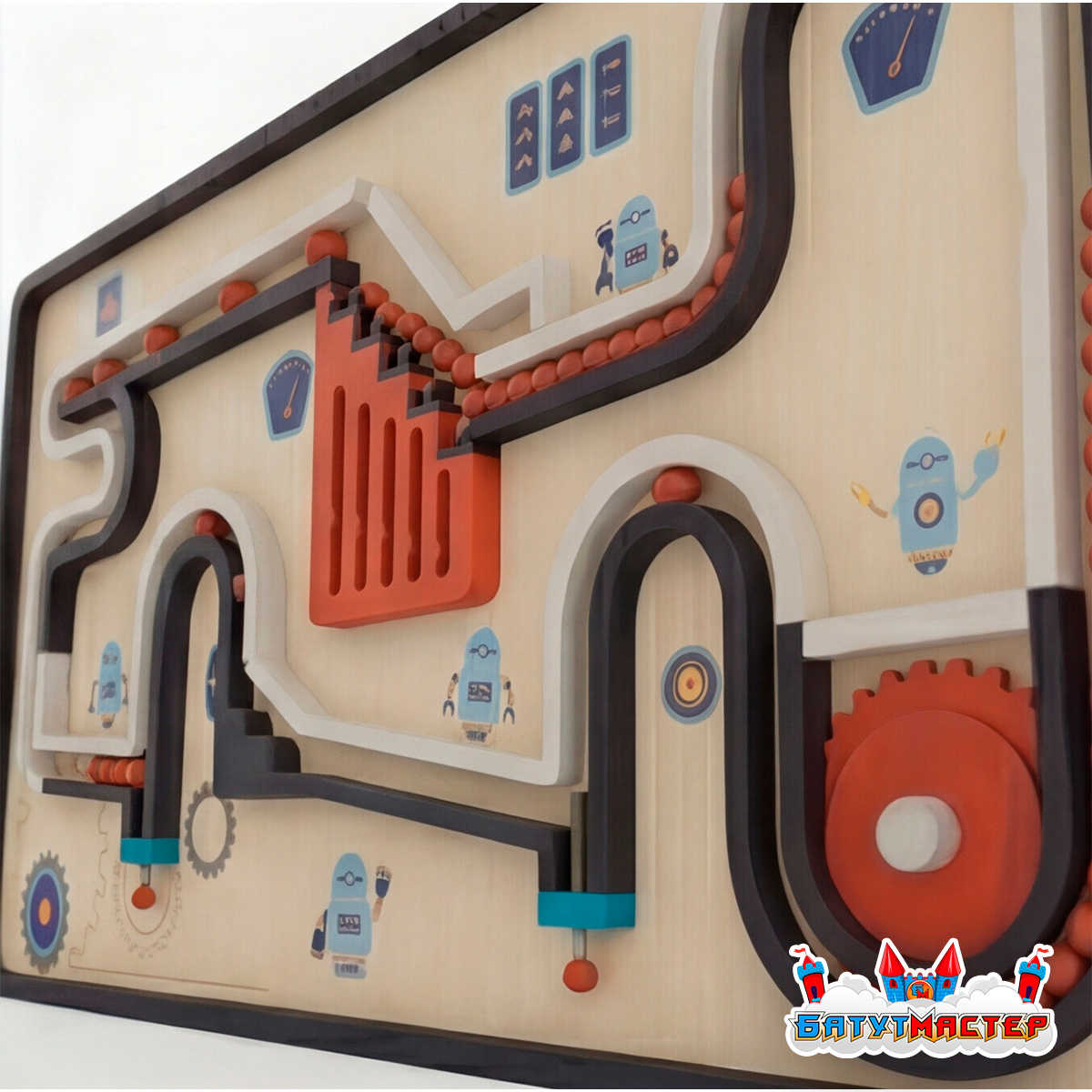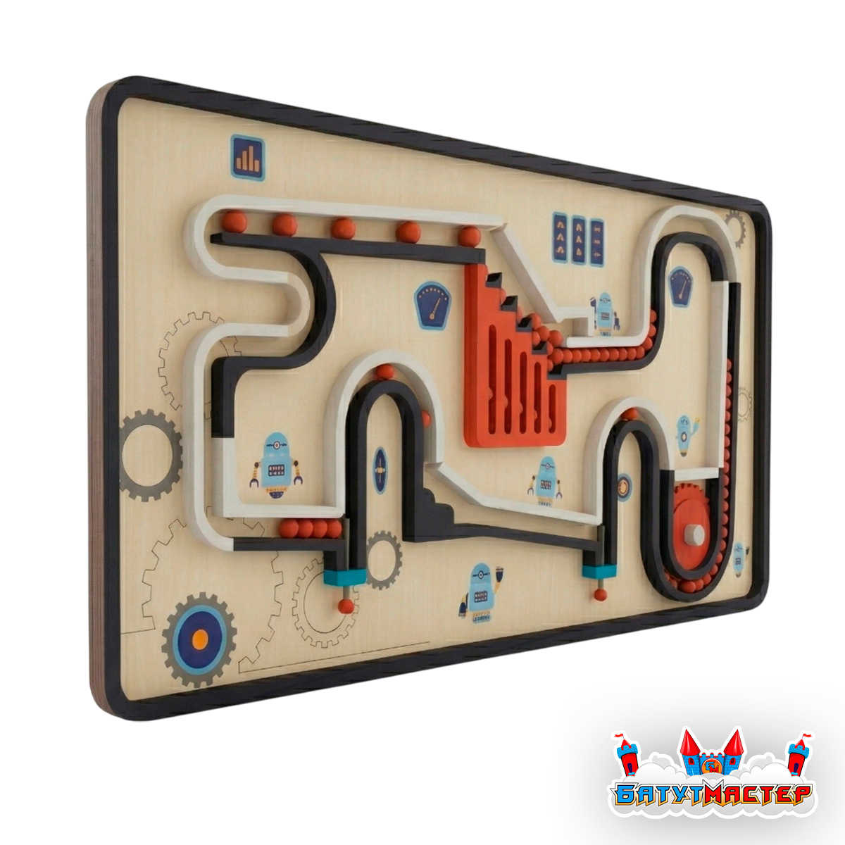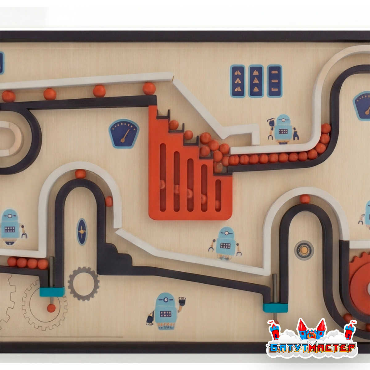 Представьте: ребёнок подходит к яркой панели, и любой оранжевый шарик отправляет в путь по загадочным коридорам механической лаборатории. Шарик скользит по извилистым дорожкам, поднимается по ступенчатым лестницам, ныряет в арочные тоннели и проходит мимо забавных роботов, которые словно приветствуют маленького гостя. Вращающиеся шестерёнки оживают под детскими пальцами, приборные панели мигают индикаторами, а каждый новый поворот трассы открывает неожиданный маршрут.