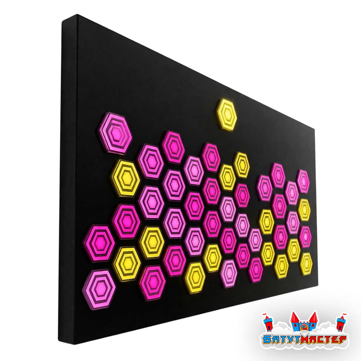 Интерактивная стена «Неосоты» представляет собой панель с объёмными сенсорными шестигранниками, каждый из которых оснащён: