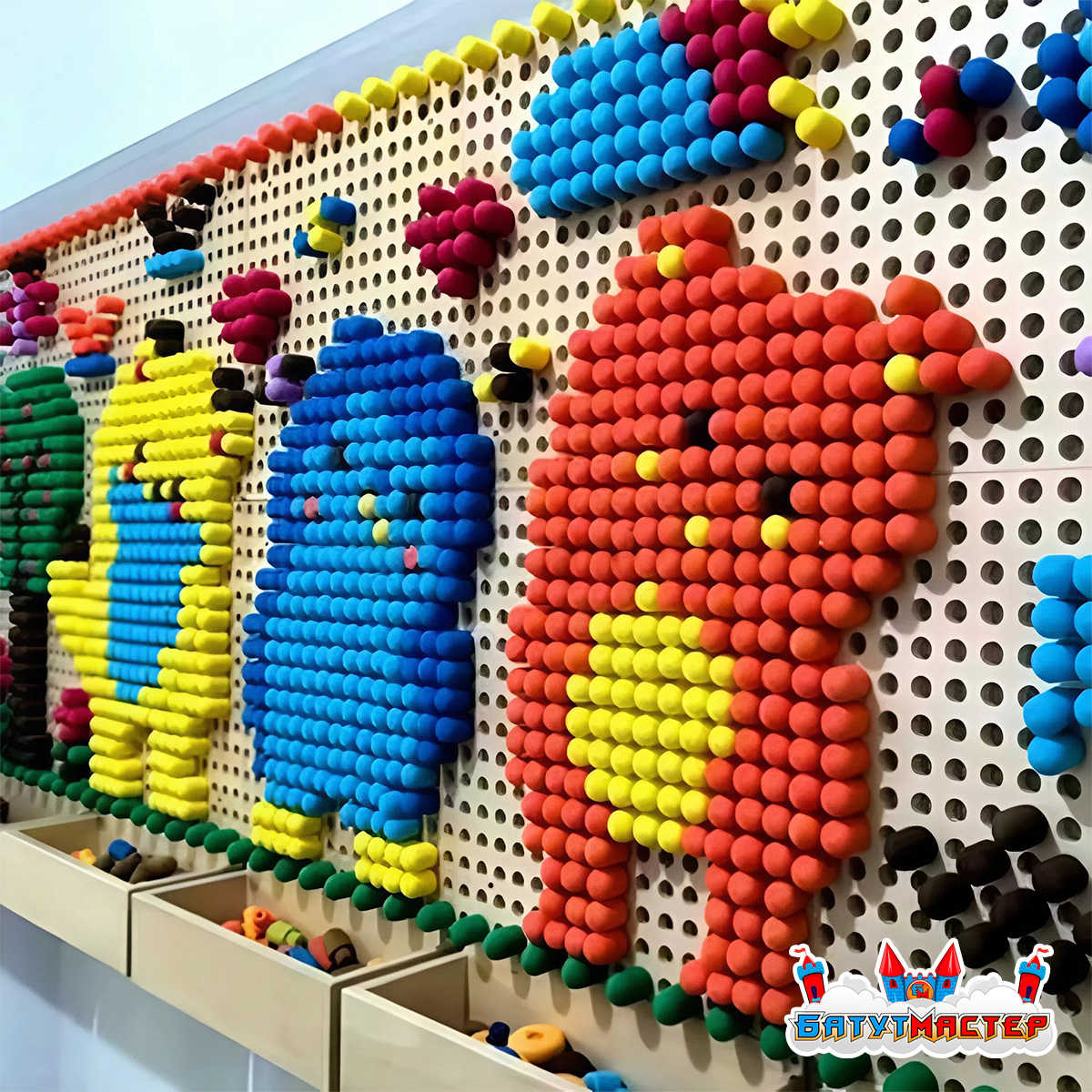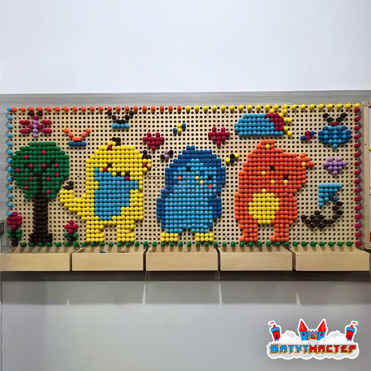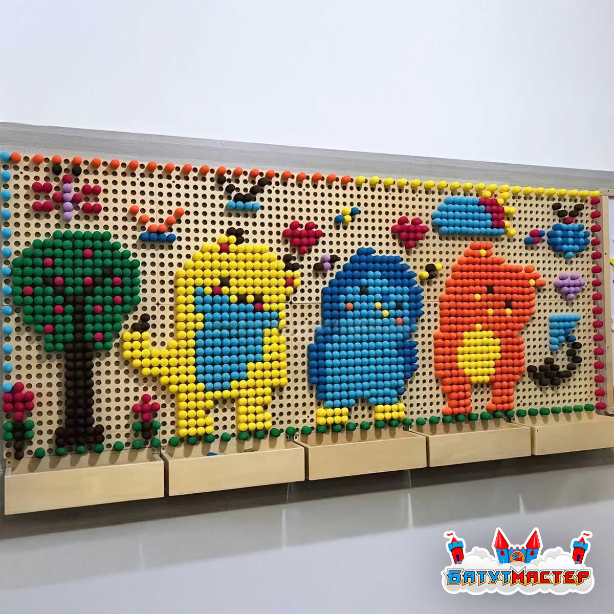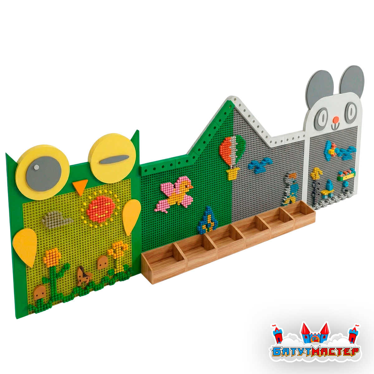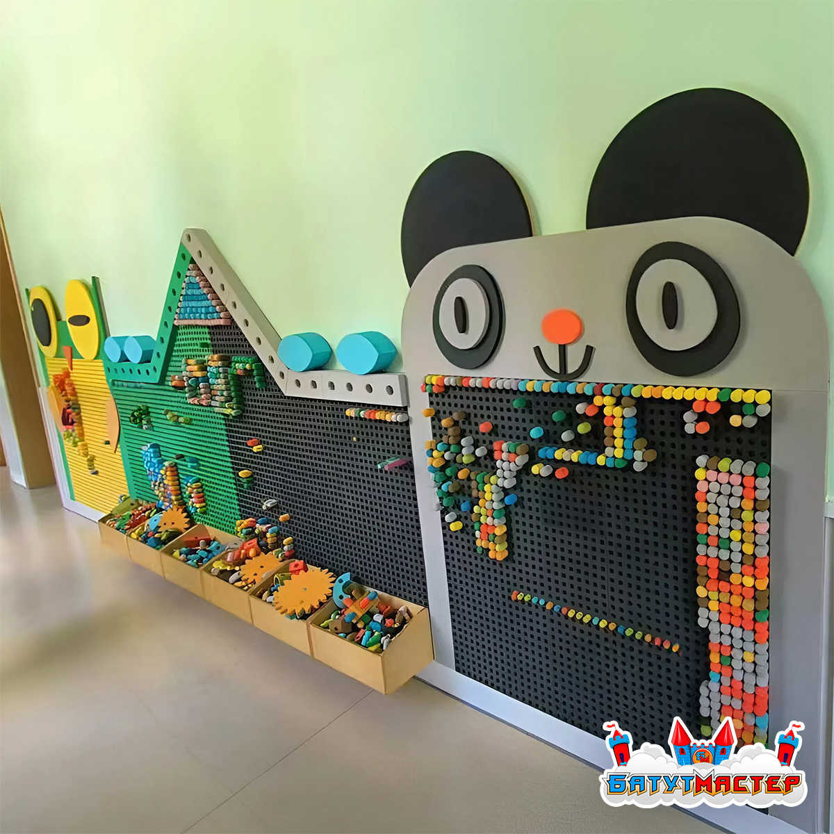 Мозаичные элементы разных цветов и форм легко крепятся к панелям, позволяя детям снова и снова менять картину. Это как конструктор, только вертикальный и гораздо более масштабный!