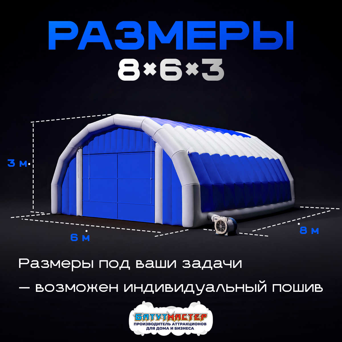 Внутри — 48 м² полезной площади (8 × 6 м) и арочный проём высотой 3 м. Этого достаточно для размещения малогабаритной строительной или сельскохозяйственной техники, организации ремонтного участка, временного склада или крытой зоны приёма товаров.