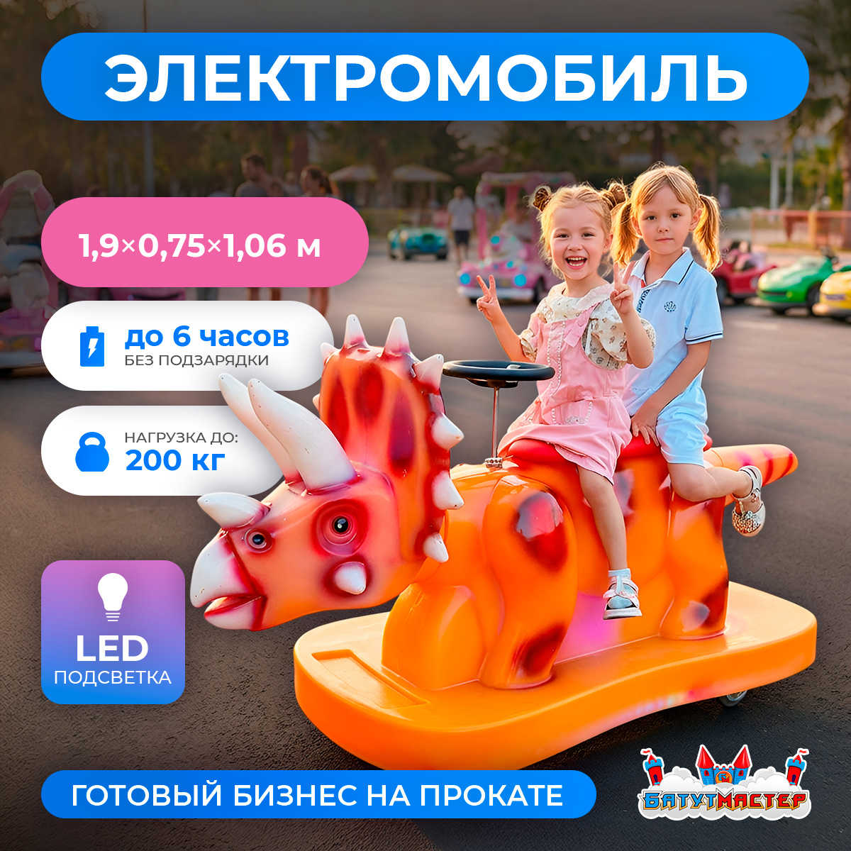 Там, где начинается легендаПредставьте: летний вечер, набережная, мягкий закат — и по дорожке неспешно едет оранжевый трицератопс с двумя хохочущими детьми на спине. Очередь у прокатной точки выстраивается сама собой. Именно так работает «Дино заезд» — не просто электромобиль, а живой аттракцион, который продаёт себя сам.