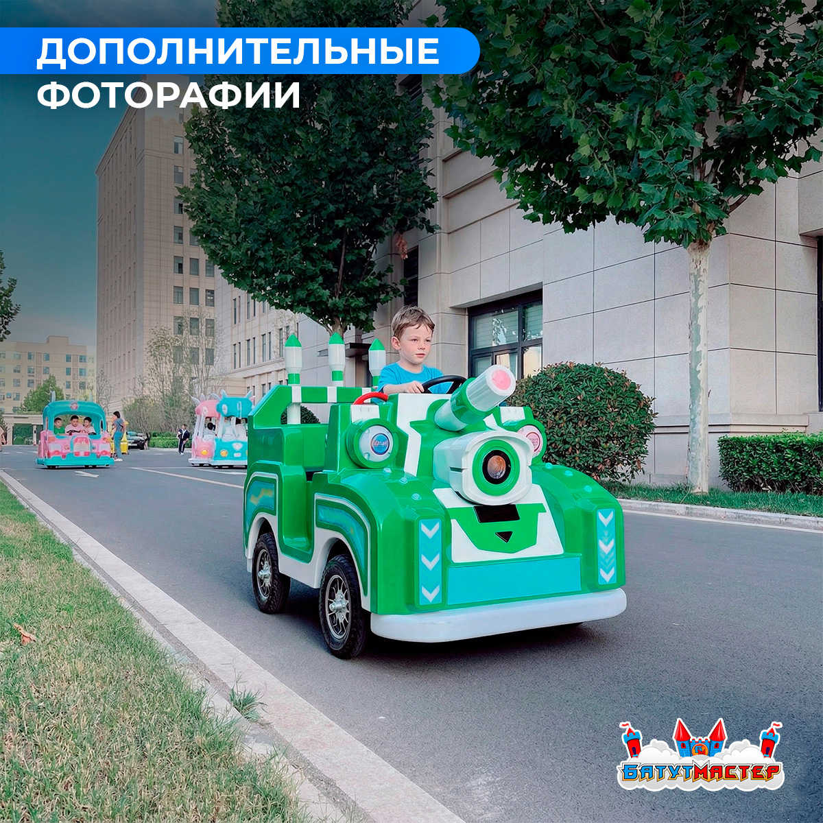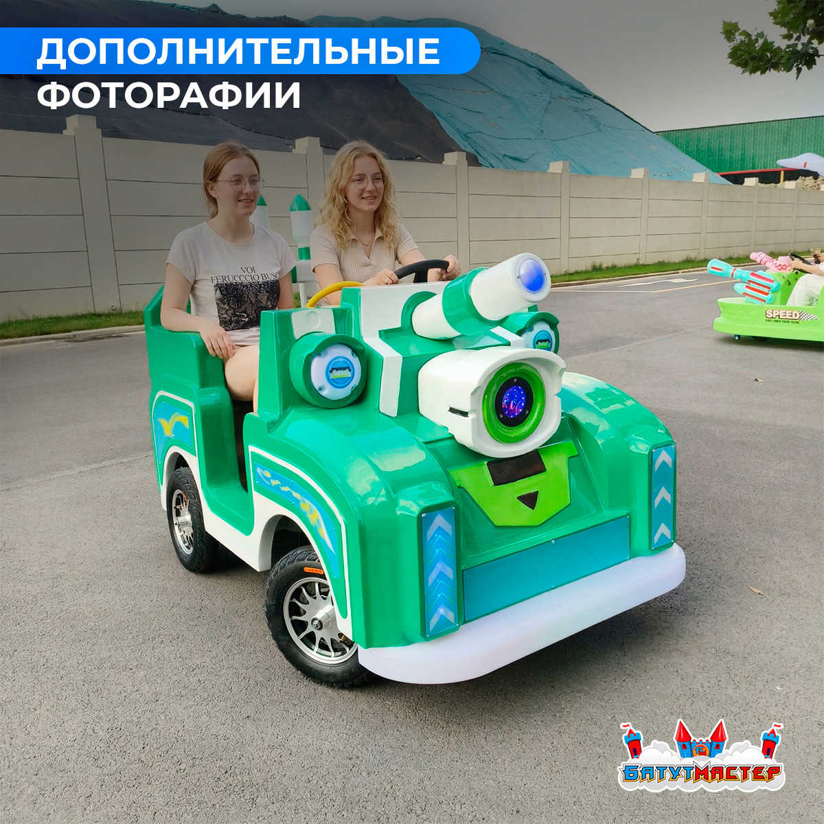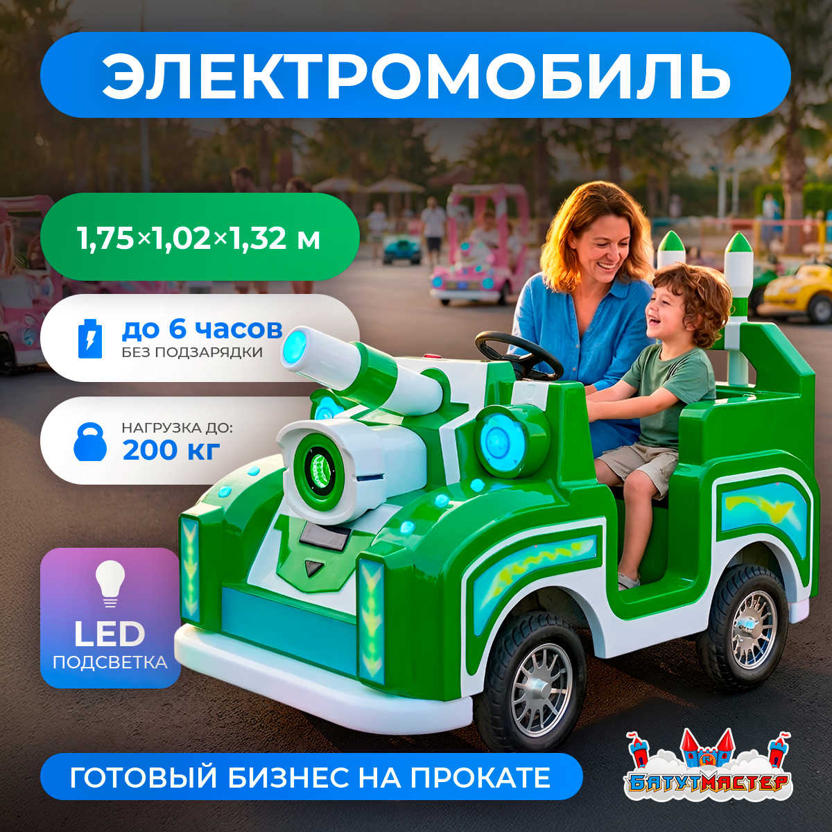 Представьте: солнечный день, парк, аллея. И вдруг из-за поворота появляется он — массивный, зелёный, с синими огнями и настоящей пушкой на капоте. Дети замирают на секунду… а потом бегут к нему со всех ног. «Зелёный патруль» — это не просто электромобиль. Это аттракцион, легенда и магнит для посетителей в одном корпусе. Пока другие операторы считают пустые круги, владельцы «Зелёного патруля» считают прибыль.