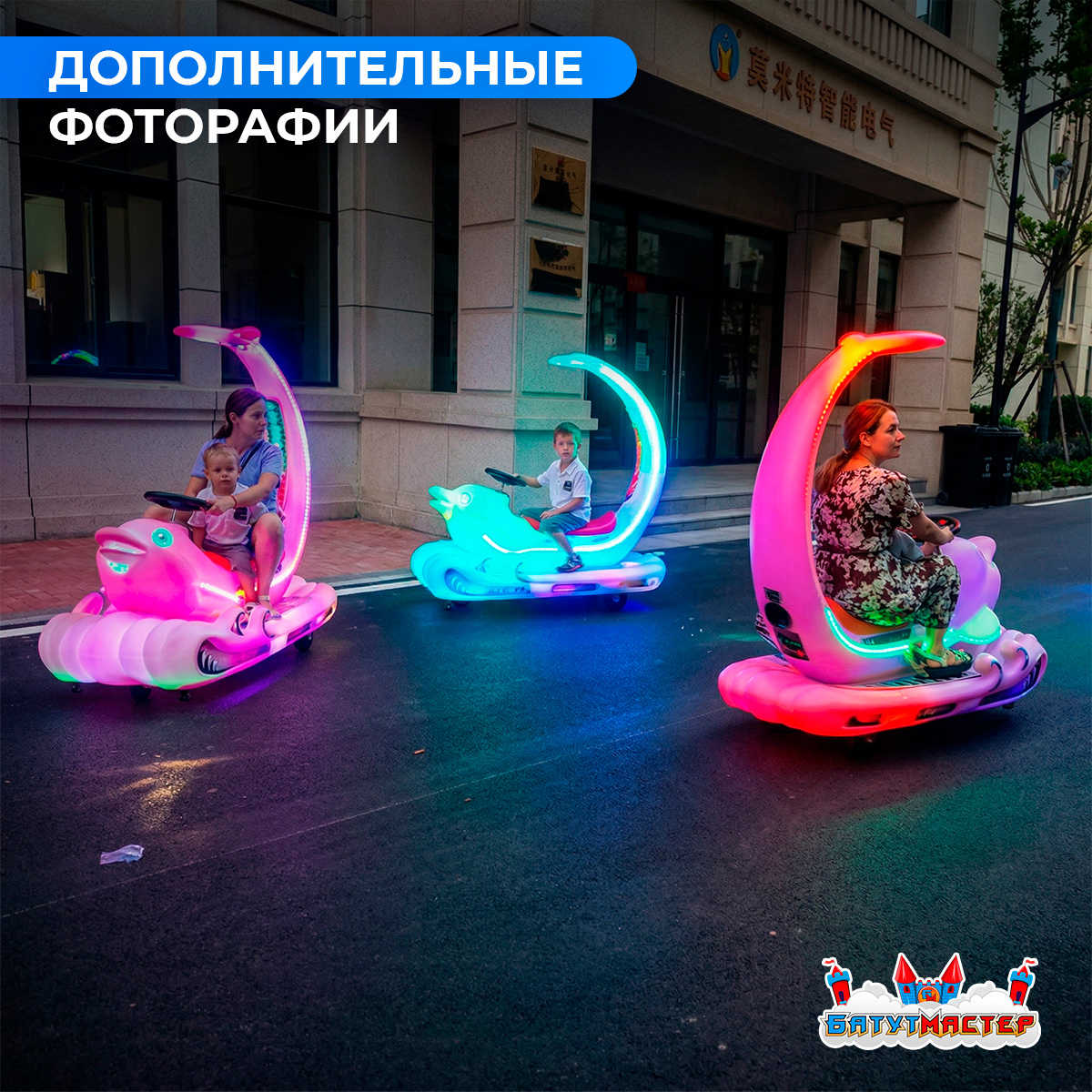 Его бирюзовый корпус в форме морского дельфина с поднятым хвостом и переливающейся LED-подсветкой — это не просто транспорт, это живая точка притяжения на любой площадке. Он работает на вас ещё до того, как первый ребёнок сядет в седло: привлекает взгляды, генерирует интерес и формирует очередь.