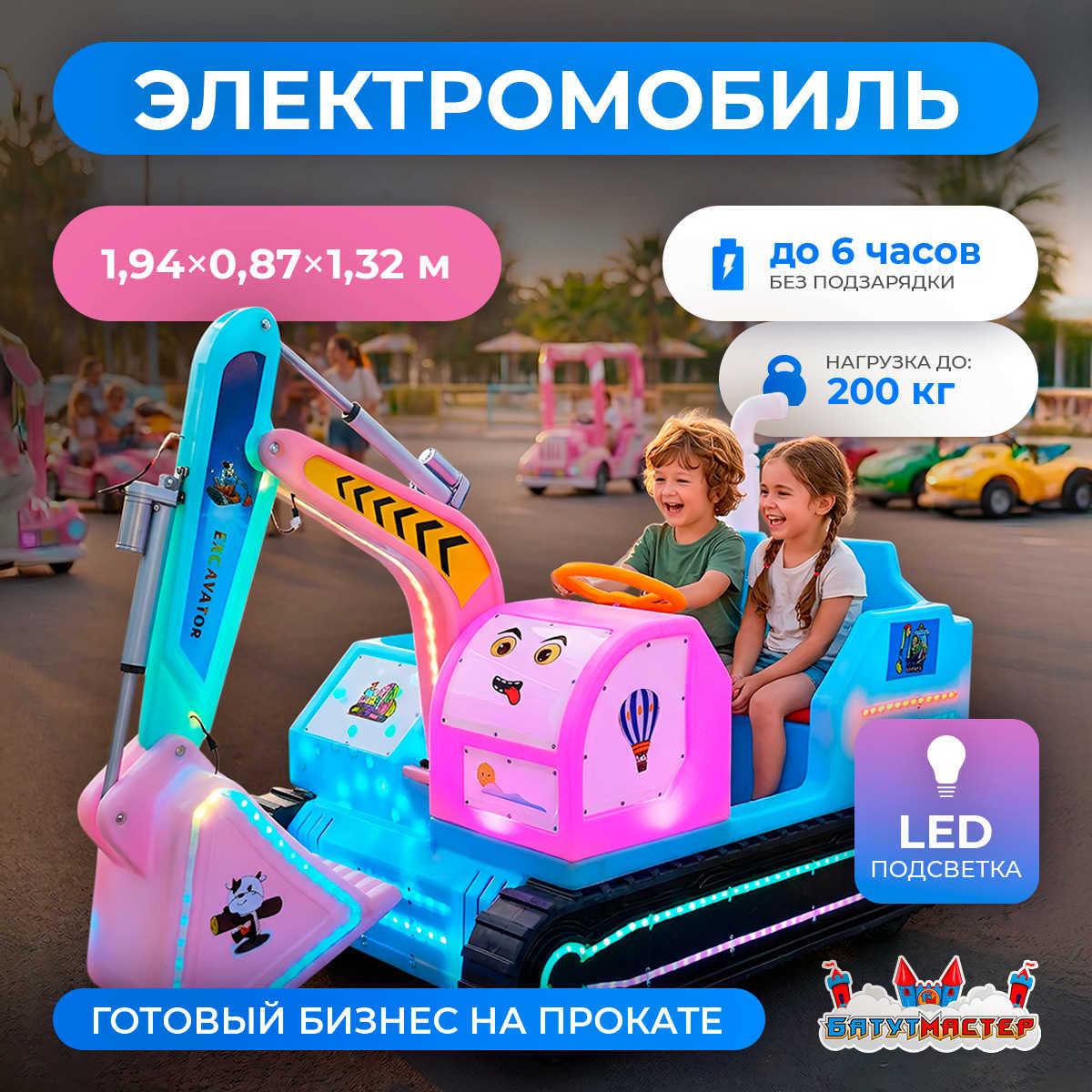 Представьте: ребёнок садится за руль настоящего гусеничного экскаватора — яркого, светящегося, с ковшом и весёлыми наклейками. Рядом — лучший друг или младший брат. Двигатель тихо гудит, гусеницы уверенно катятся вперёд, а глаза детей светятся от восторга. «СтройМобиль» — это не просто аттракцион. Это первый шаг к большим мечтам, упакованный в надёжный коммерческий электромобиль, который окупает себя уже в первый сезон.