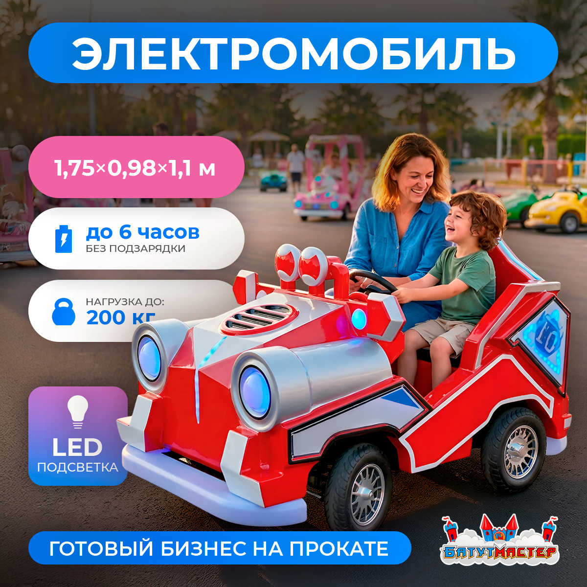 Представьте: яркий солнечный день, детский смех, и ваш аттракцион уже собирает очередь из желающих прокатиться. Именно такую картину создаёт электромобиль «Турбо-Джип» — двухместная коммерческая машина с космическим дизайном, которая с первой секунды приковывает взгляды детей и заставляет родителей тянуться за кошельком.