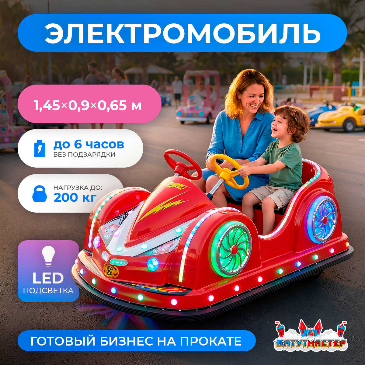 Каждый день промедления — это смены, которые уже катаются у вашего конкурента. «Турбо-Огни» — это аттракцион, который окупается в первые недели, работает без выходных и сам привлекает клиентов своим видом. 2 места, 350 Вт, 6 часов автономности и LED-подсветка, от которой невозможно отвести взгляд. Один электромобиль — и ваша точка уже на карте детских развлечений города. Добавьте в корзину и запустите прокат уже в эти выходные. 🚀