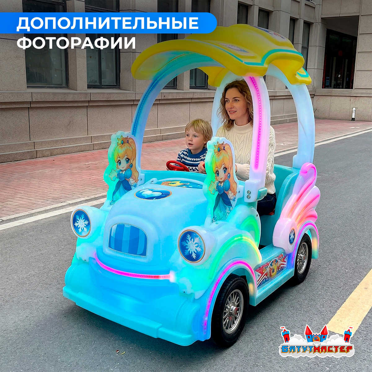 «Хрустальная сказка» — это не просто транспортное средство, это аттракцион-персонаж. Бирюзово-белый корпус с золотистой крышей в форме лепестка, изображения принцессы по бокам и переливающаяся LED-подсветка по всему периметру создают эффект живой сказки. В вечернее время электромобиль светится и привлекает внимание за десятки метров — что особенно ценно на набережных, в парках и у входа в ТРЦ. Такой аттракцион фотографируют, снимают видео и отмечают в социальных сетях — бесплатная реклама вашей точки проката.
