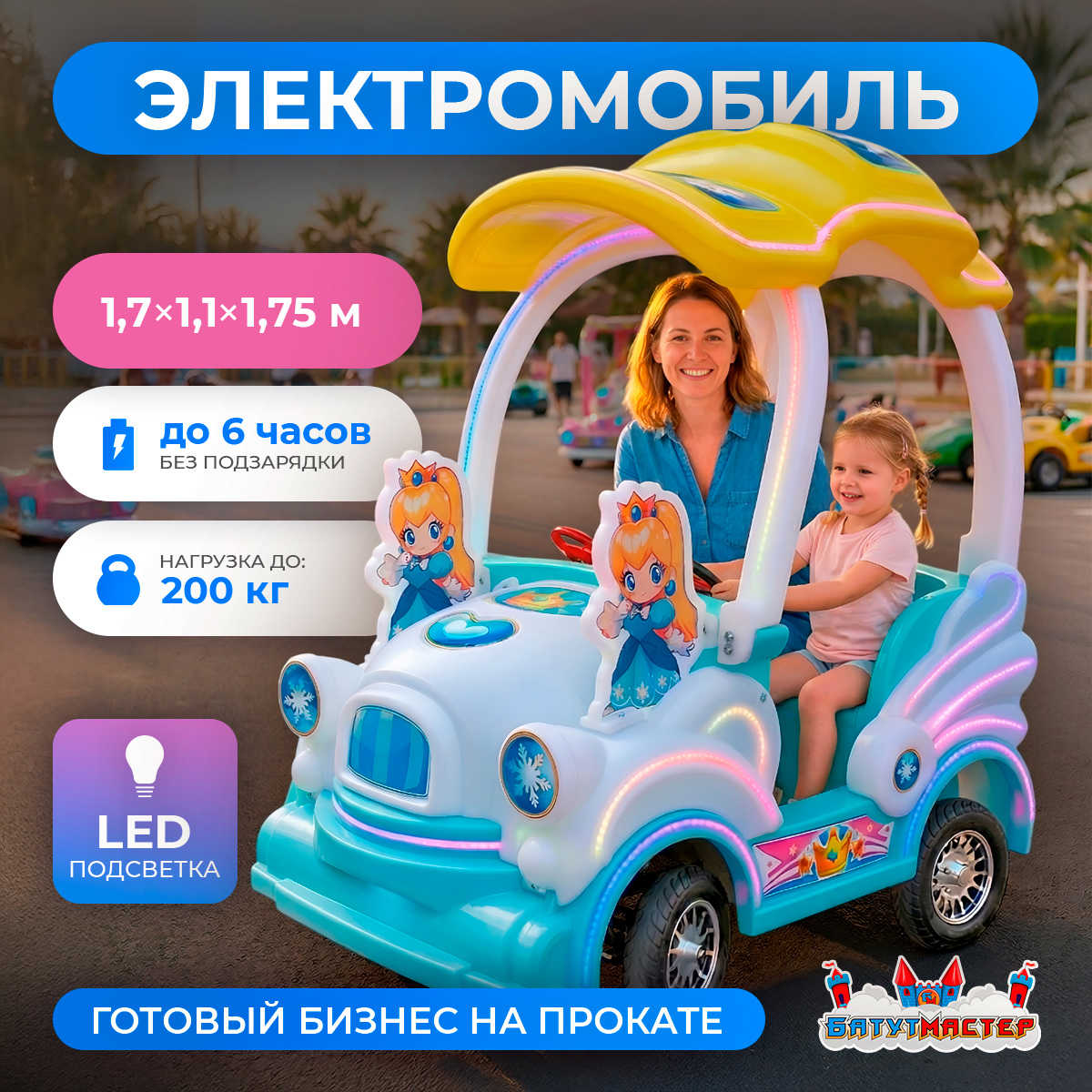 Представьте: солнечный день, набережная, и среди всех аттракционов внимание детей и родителей притягивает один — переливающийся LED-огнями электромобиль в образе сказочной принцессы. Дети тянут за руку, родители уже достают кошелёк. Именно так работает «Хрустальная сказка» — коммерческий двухместный электромобиль, который создан не просто для катания, а для бизнеса с очередью из клиентов.